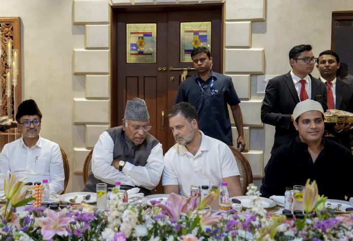 New Delhi: Leader of Opposition Rahul Gandhi, Congress president Mallikarjun Kharge and Congress Minority Department chairman Imran Pratapgarhi during an Iftar party hosted by Pratapgarhi at his residence, in New Delhi, Tuesday, March 10, 2026. (PTI Photo/Ravi Choudhary)(PTI03_10_2026_000428B)