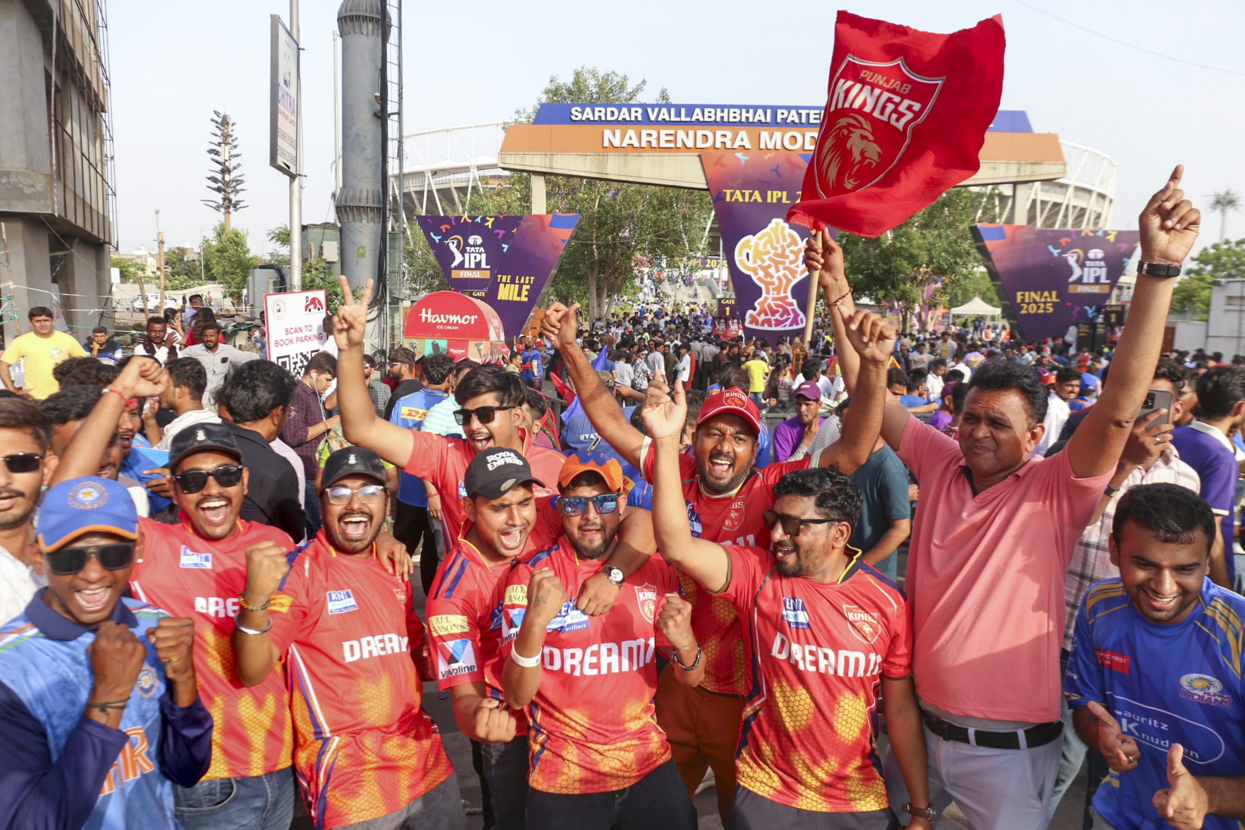 Ahmedabad: Fans cheer as they arrive to watch the Indian Premier League (IPL) 2025 Qualifier 2 T20 cricket match between Mumbai Indians and Punjab Kings at the Narendra Modi Stadium, in Ahmedabad, Sunday, June 1, 2025. (PTI Photo) (PTI06_01_2025_000387B)