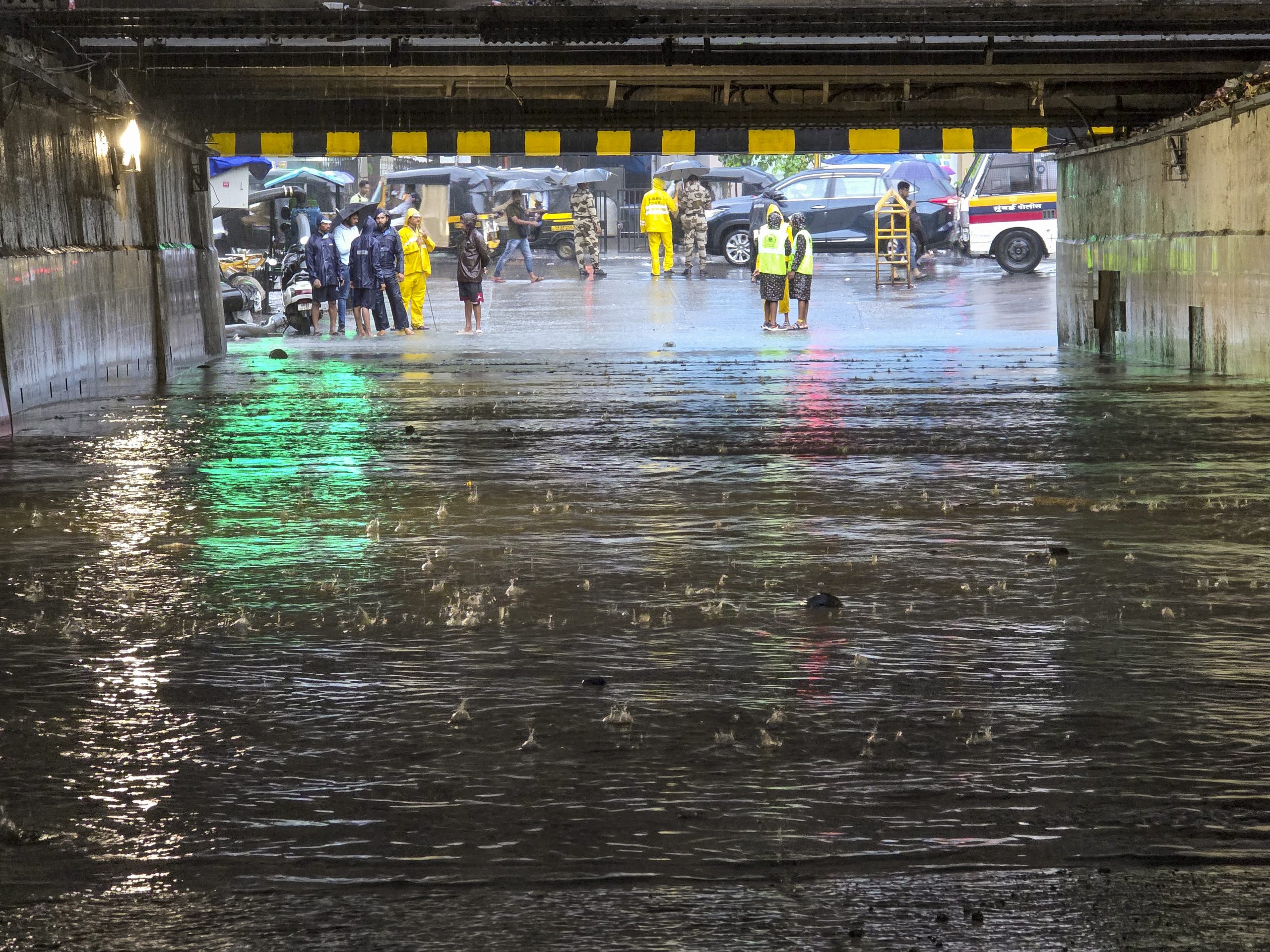 Mumbai: Security personnel and others stand outside a waterlogged underpass amid rains, in Mumbai, Monday, May 26, 2025. (PTI Photo) (PTI05_26_2025_000135B)