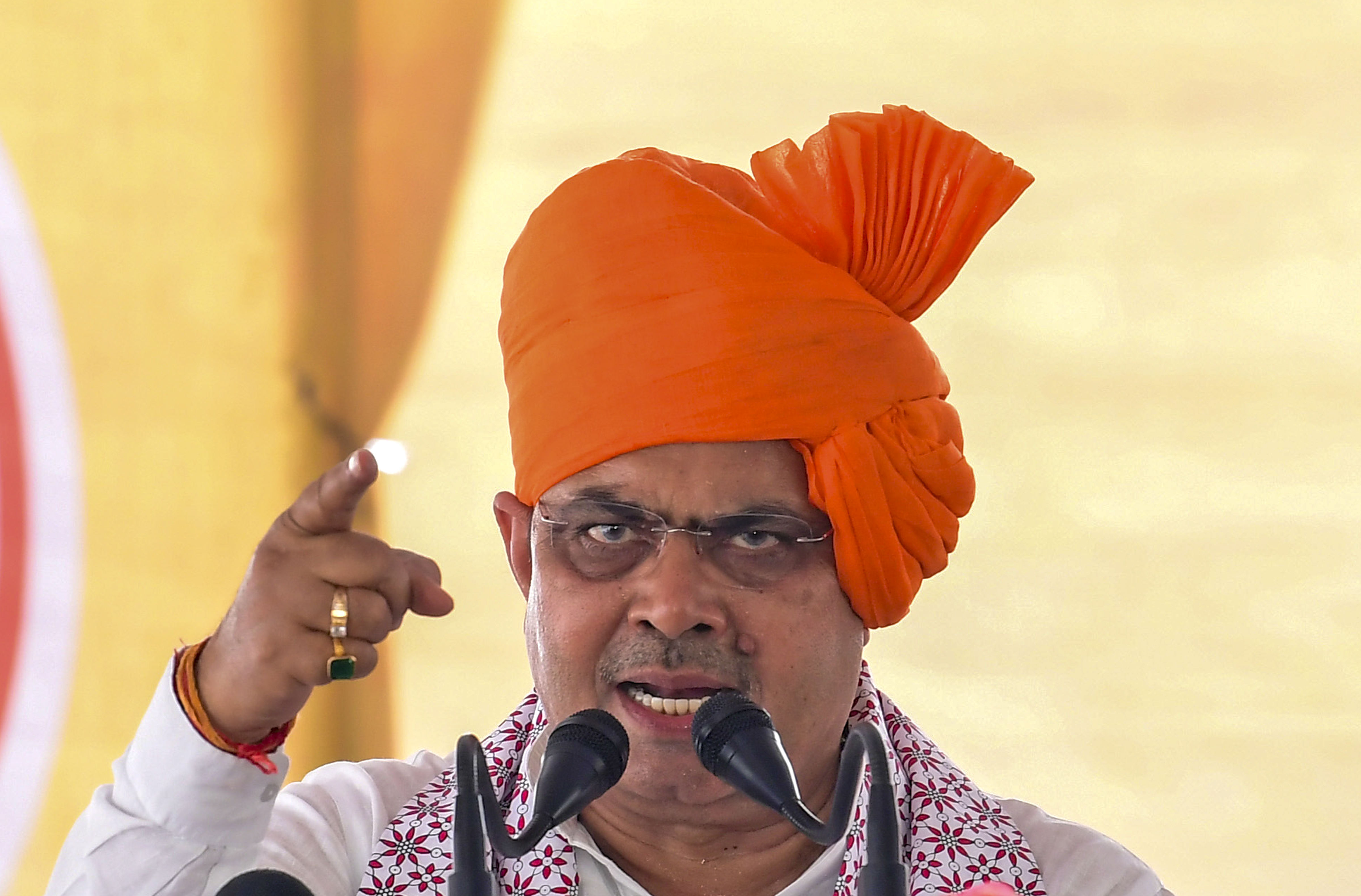 Sriganganagar: Rajasthan Chief Minister Bhajanlal Sharma addresses a BJP programme during his visit to Sriganganagar, Wednesday, Apr. 9, 2025. (PTI Photo) (PTI04_09_2025_000259B)