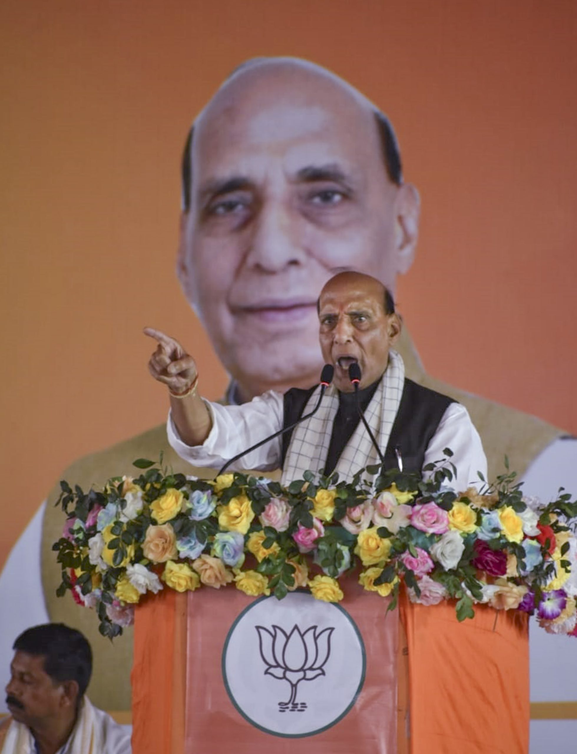 Howrah: Defence Minister Rajnath Singh addresses the 'Parivartan Yatra' rally, in Howrah district, West Bengal, Monday, March 2, 2026. (PTI Photo) (PTI03_02_2026_000309B)