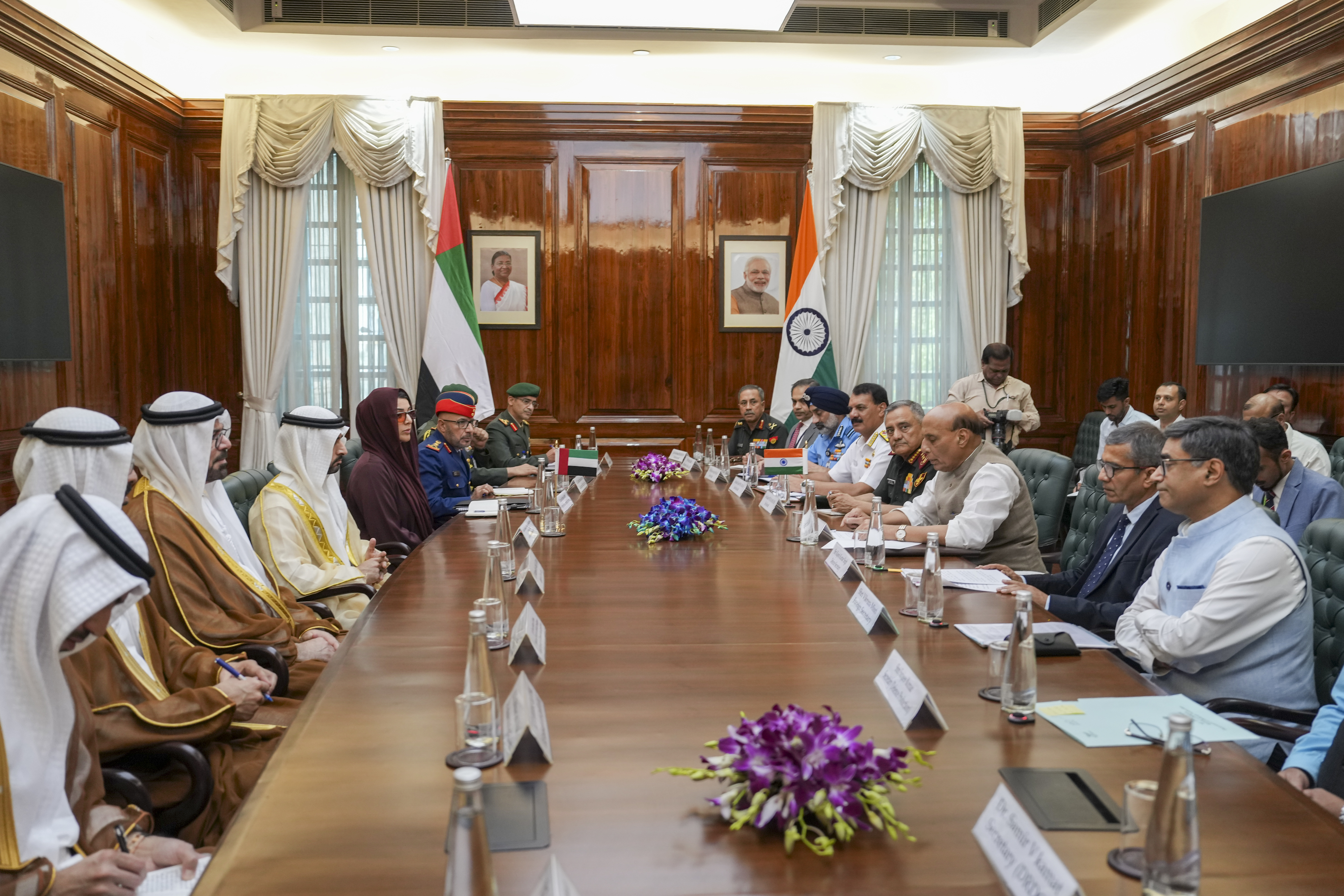 New Delhi: Defence Minister Rajnath Singh with Crown Prince of Dubai and Deputy Prime Minister and Minister of Defence of UAE Sheikh Hamdan bin Mohammed bin Rashid Al Maktoum during a meeting, in New Delhi, Tuesday, April 8, 2025. (PTI Photo/Kamal Singh)(PTI04_08_2025_000187B)