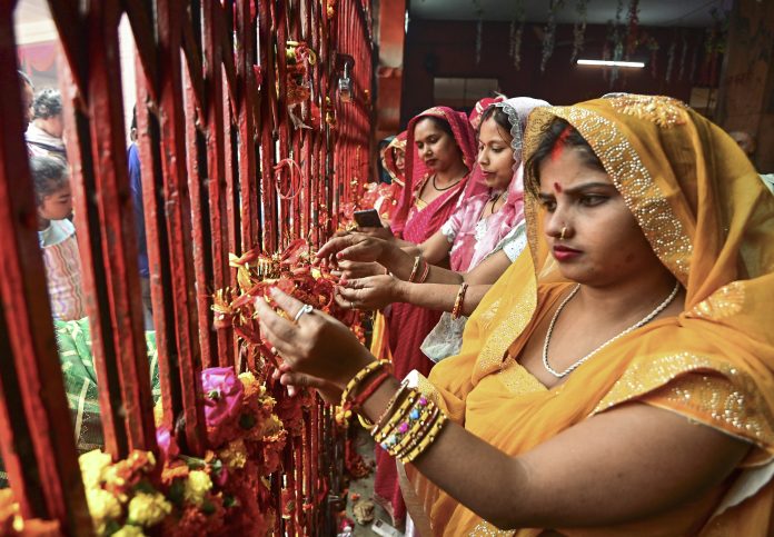 Prayagraj: People tie sacred thread and cloth on an iron grill as they offer prayers on �Ram Navami� at Alopi Shankari Devi Shakti Peeth Temple, in Prayagraj, Friday, March 27, 2026. (PTI Photo)(PTI03_27_2026_000148B)