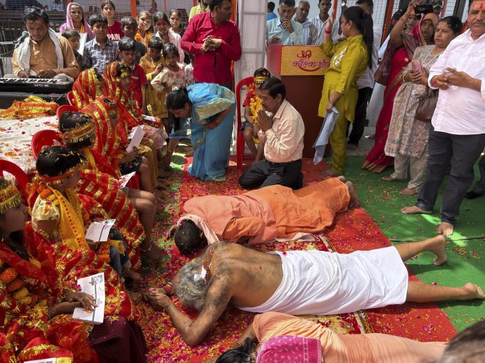Sambhal: Kalki Peethadheeshwar Acharya Pramod Krishnam worships girls on Ram Navami festival, in Sambhal, Uttar Pradesh, Sunday, April 6, 2025. (PTI Photo)(PTI04_06_2025_000270B)