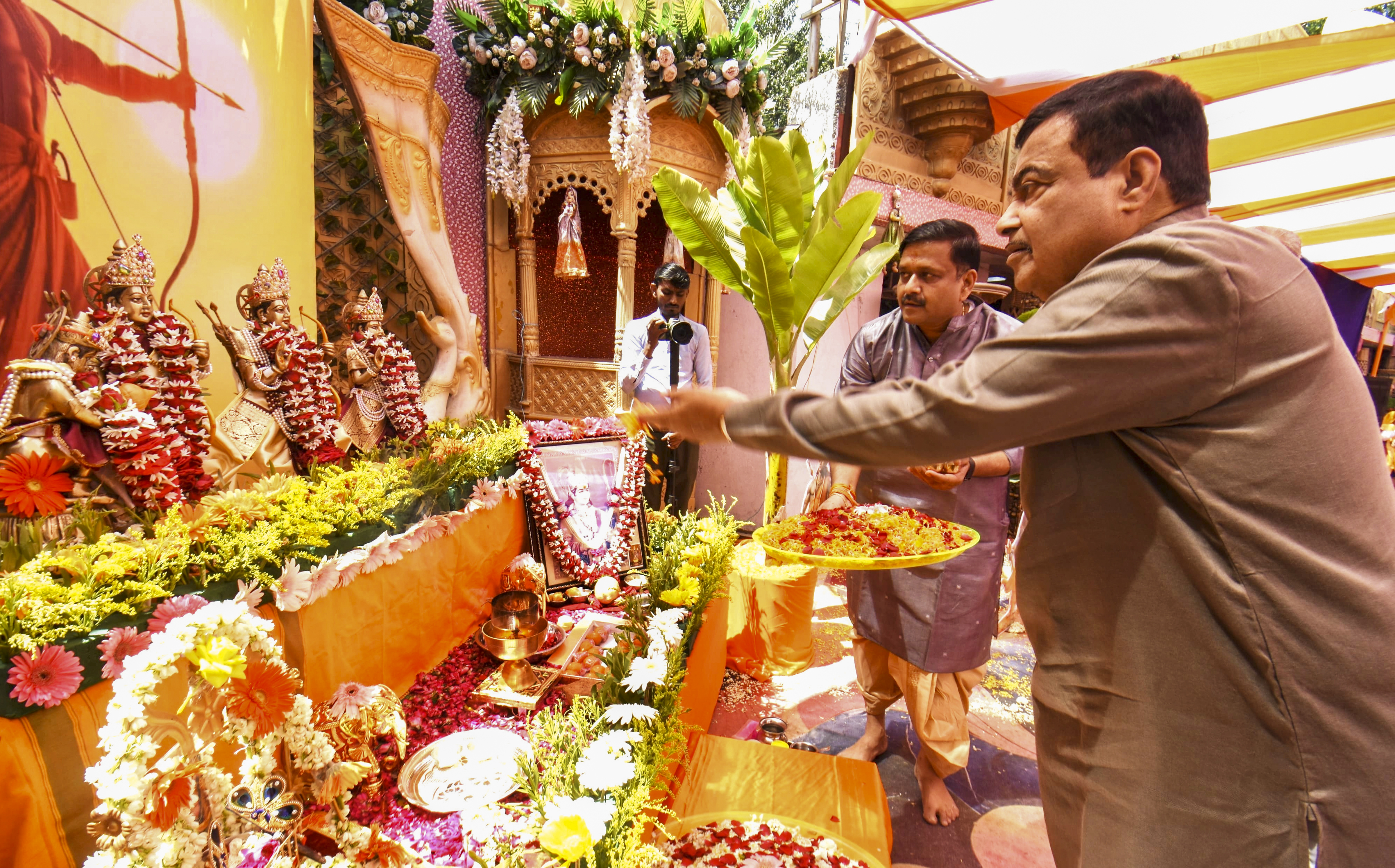 Nagpur: Union Minister Nitin Gadkari offers prayers on the occasion of ‘Ram Navami’ festival, in Nagpur, Maharashtra, Sunday, April 6, 2025. (PTI Photo) (PTI04_06_2025_000107B)