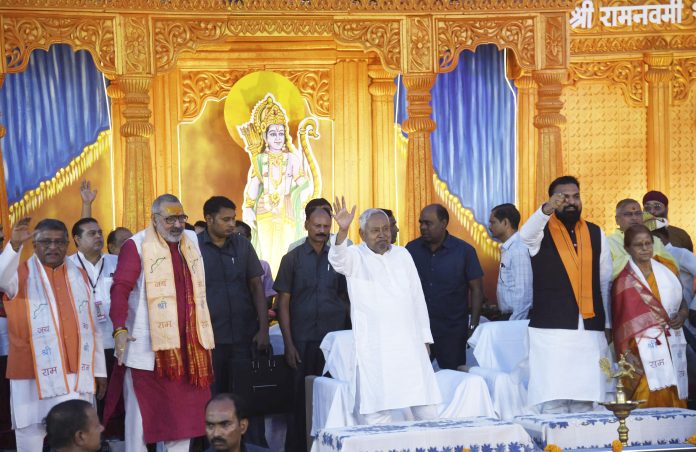 Patna: Union Minister Giriraj Singh, Bihar Chief Minister Nitish Kumar, Deputy Chief Minister Samrat Choudhary and BJP MP Ravi Shankar Prasad during a programme organised on the occasion of Ram Navami, in Patna, Sunday, April 6, 2025. (PTI Photo)(PTI04_06_2025_000392B)