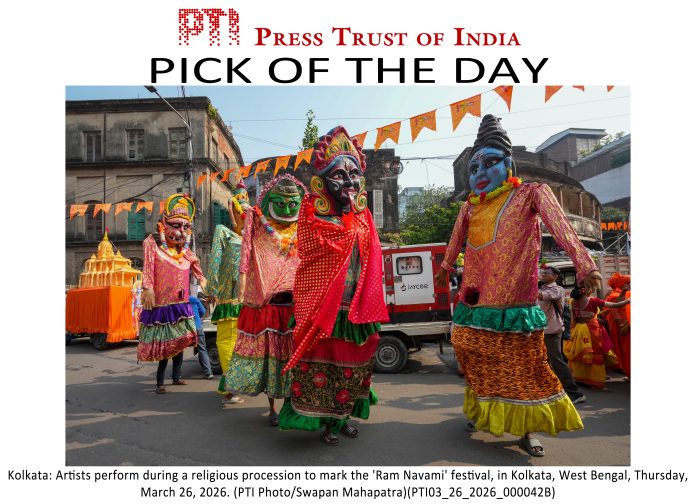 PLS TAKE NOTE OF THIS PTI PICK OF THE DAY::: Kolkata: Artists perform during a religious procession to mark the ‘Ram Navami’ festival, in Kolkata, West Bengal, Thursday, March 26, 2026. (PTI Photo/Swapan Mahapatra)(PTI03_26_2026_000042B)(PTI03_26_2026_000322B)