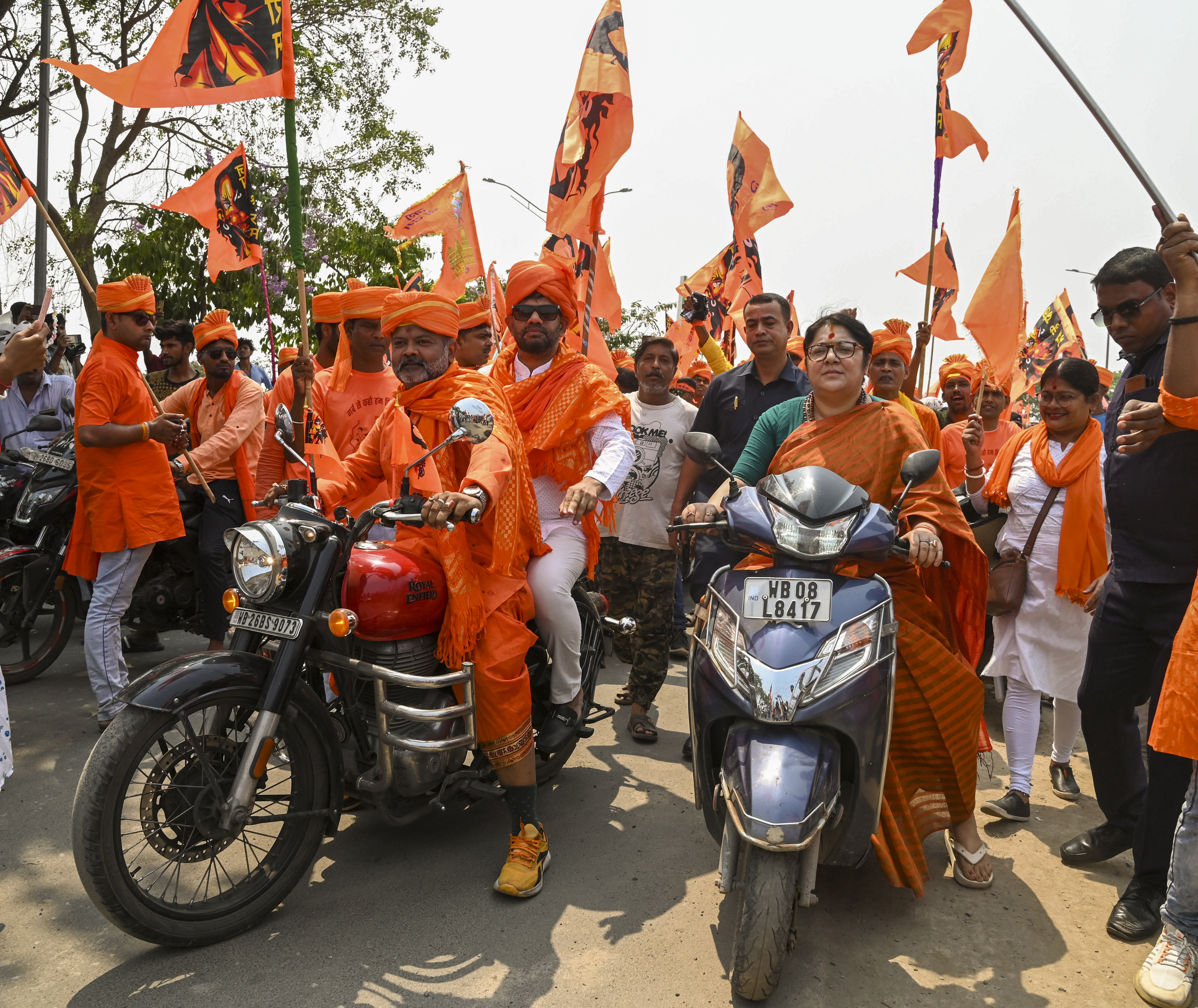 Kolkata: BJP leader Locket Chatterjee rides a scooty as she participates in a Ram Navami procession, in Kolkata, Sunday, April 6, 2025. (PTI Photo)(PTI04_06_2025_000082B)