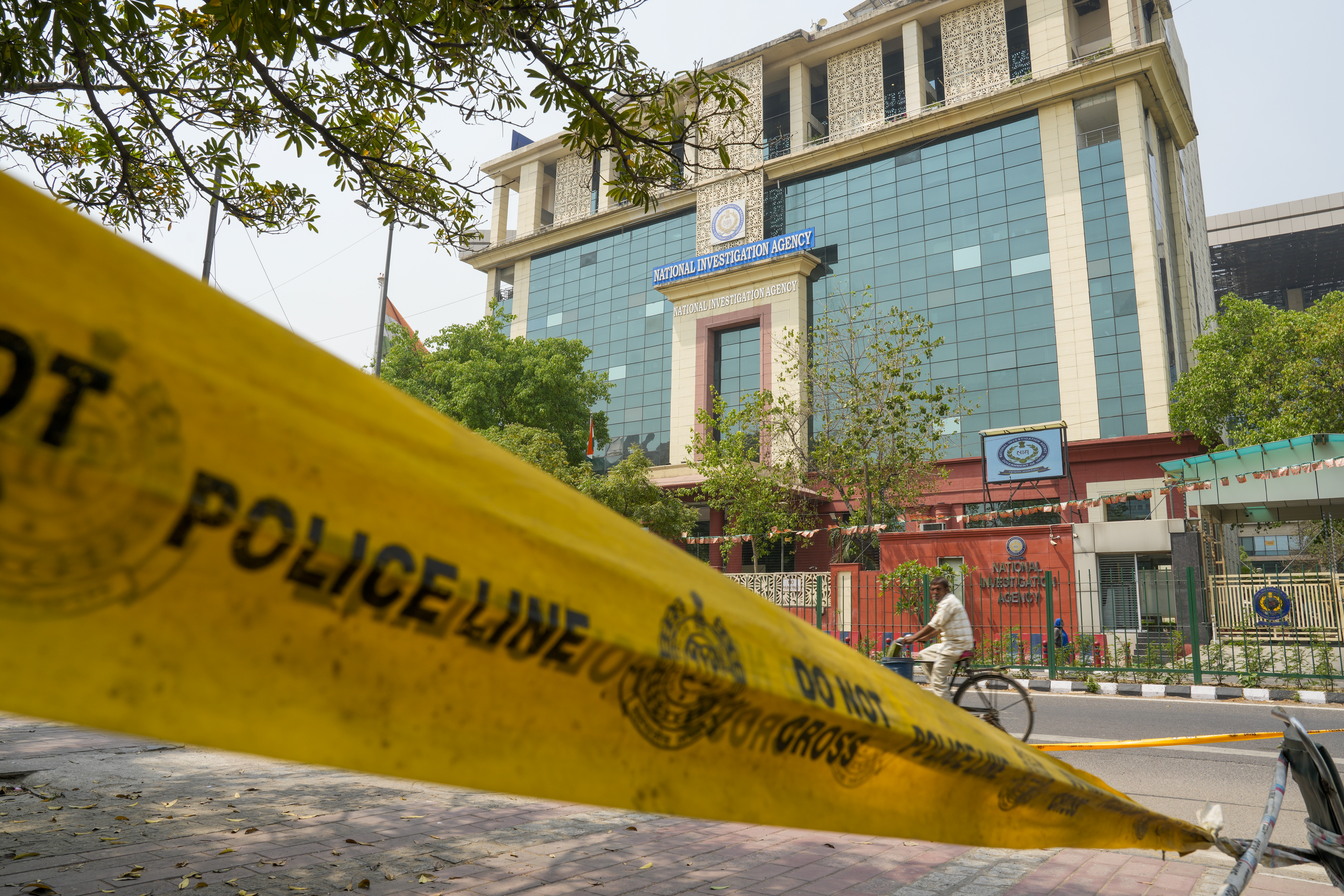 New Delhi: ‘Do Not Cross’ police barricade tape fixed near the National Investigation Agency building, in New Delhi, Thursday, Apr. 10, 2025. Tahawwur Rana, a co-conspirator in the 26/11 Mumbai terror attacks, will land in India today, a day after a multi-agency Indian team left from the United States with him on a special flight on Wednesday. (PTI Photo/Ravi Choudhary) (PTI04_10_2025_000041B)