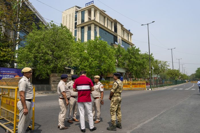 New Delhi: Police personnel stand guard near the National Investigation Agency building, in New Delhi, Thursday, Apr. 10, 2025. Tahawwur Rana, a co-conspirator in the 26/11 Mumbai terror attacks, will land in India today, a day after a multi-agency Indian team left from the United States with him on a special flight on Wednesday. (PTI Photo/Ravi Choudhary) (PTI04_10_2025_000043B)