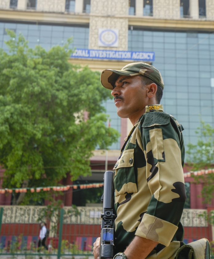 **EDS: RPT, CORRECTS TYPO IN CAPTION** New Delhi: A security official guards outside the National Investigation Agency headquarters, in New Delhi, Thursday, April 10, 2025. Tahawwur Rana, a co-conspirator in the 26/11 Mumbai terror attacks, will land in India today, a day after a multi-agency Indian team left from the United States with him on a special flight on Wednesday. (PTI Photo/Ravi Choudhary) (PTI04_10_2025_RPT184B)