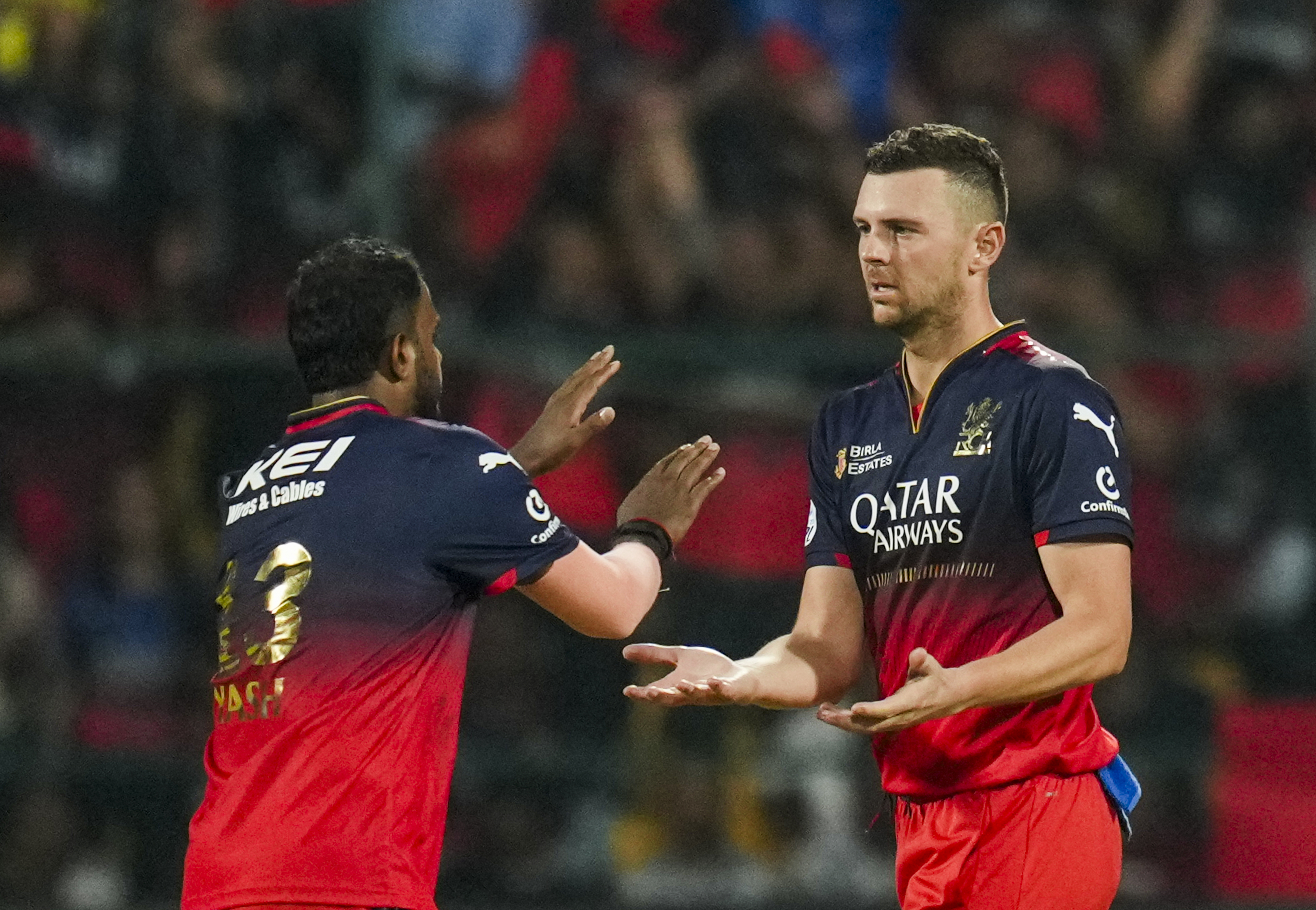 Bengaluru: Royal Challengers Bengaluru's Josh Hazlewood with teammate celebrates the wicket of Rajasthan Royals' Jofra Archer during the Indian Premier League (IPL) 2025 cricket match between Royal Challengers Bengaluru and Rajasthan Royals, at M Chinnaswamy stadium in Bengaluru, Thursday, April 24, 2025. (PTI Photo/Shailendra Bhojak) (PTI04_24_2025_000676B)