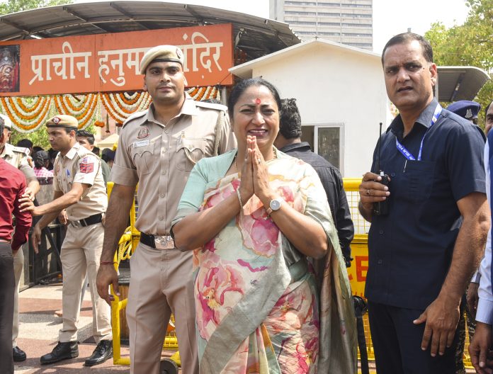 New Delhi: Delhi Chief Minister Rekha Gupta visits Hanuman Temple on the occasion of Hanuman Jayanti, at Connaught Place, in New Delhi, Saturday, April 12, 2025. (PTI Photo)(PTI04_12_2025_000215B)