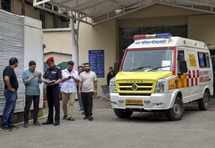 Dehradun: Officials and others gather outside a hospital in connection with the killing of 74-year old retired Army brigadier Mukesh Joshi, who died after getting caught in cross firing between two car occupants during a road rage incident, in Dehradun, Uttarakhand, Monday, March 30, 2026. (PTI Photo) (PTI03_30_2026_000211B) *** Local Caption ***