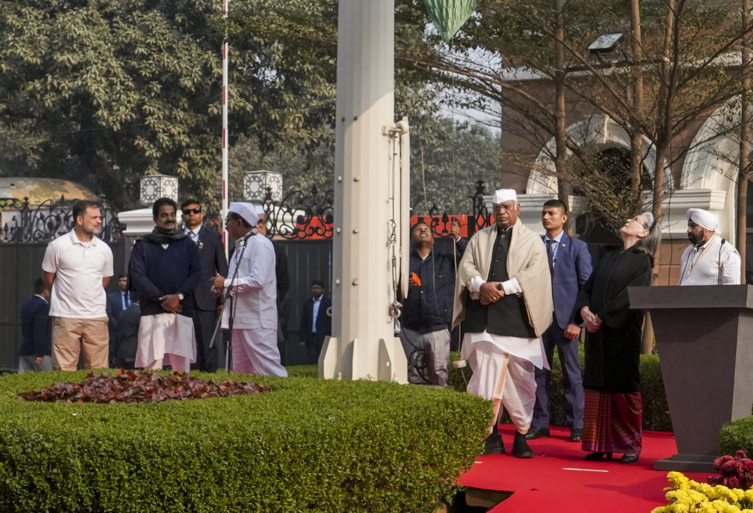 New Delhi: Congress President Mallikarjun Kharge, LoP in the Lok Sabha and party leader Rahul Gandhi, party MPs Sonia Gandhi, KC Venugopal and others during the flag-hoisting ceremony marking the 140th Foundation Day of the party, at Indira Bhawan in New Delhi, Sunday, Dec. 28, 2025. (PTI Photo/Arun Sharma)(PTI12_28_2025_000026B)