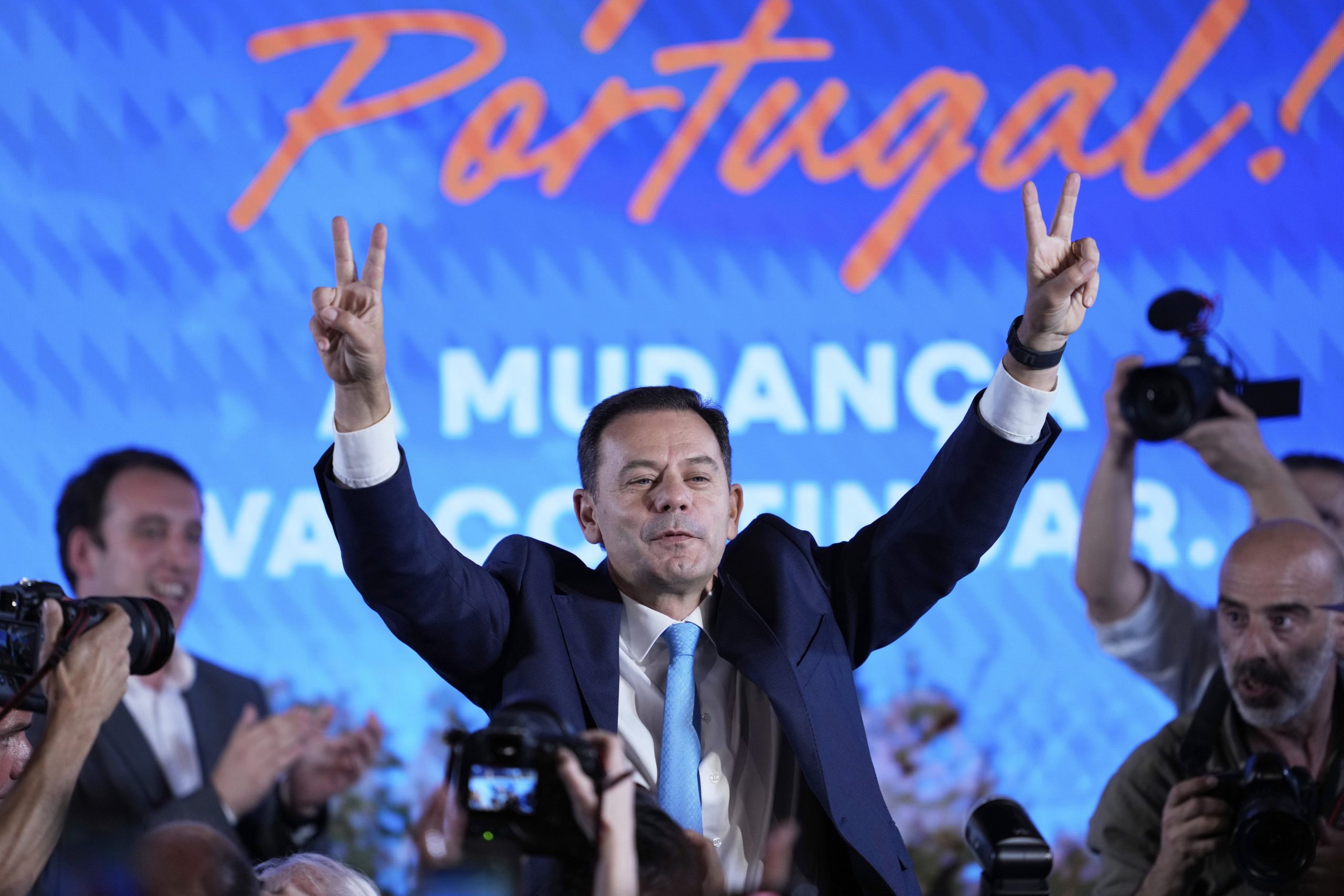 Incumbent Prime Minister and leader of the center-right Social Democratic Party Luis Montenegro gestures while addressing his supporters following Portugal's general election, in Lisbon, Monday, May 19, 2025. (AP/PTI)(AP05_19_2025_000004B)