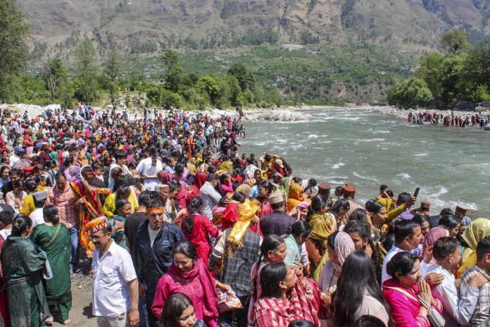 Kullu: People gather to perform royal bath of deity Markandeya Rishi Tharas on the banks of Beas and Gomti river on the occasion of Baisakhi, in Kullu, Sunday, April 13, 2025. (PTI Photo) (PTI04_13_2025_000213B) *** Local Caption ***