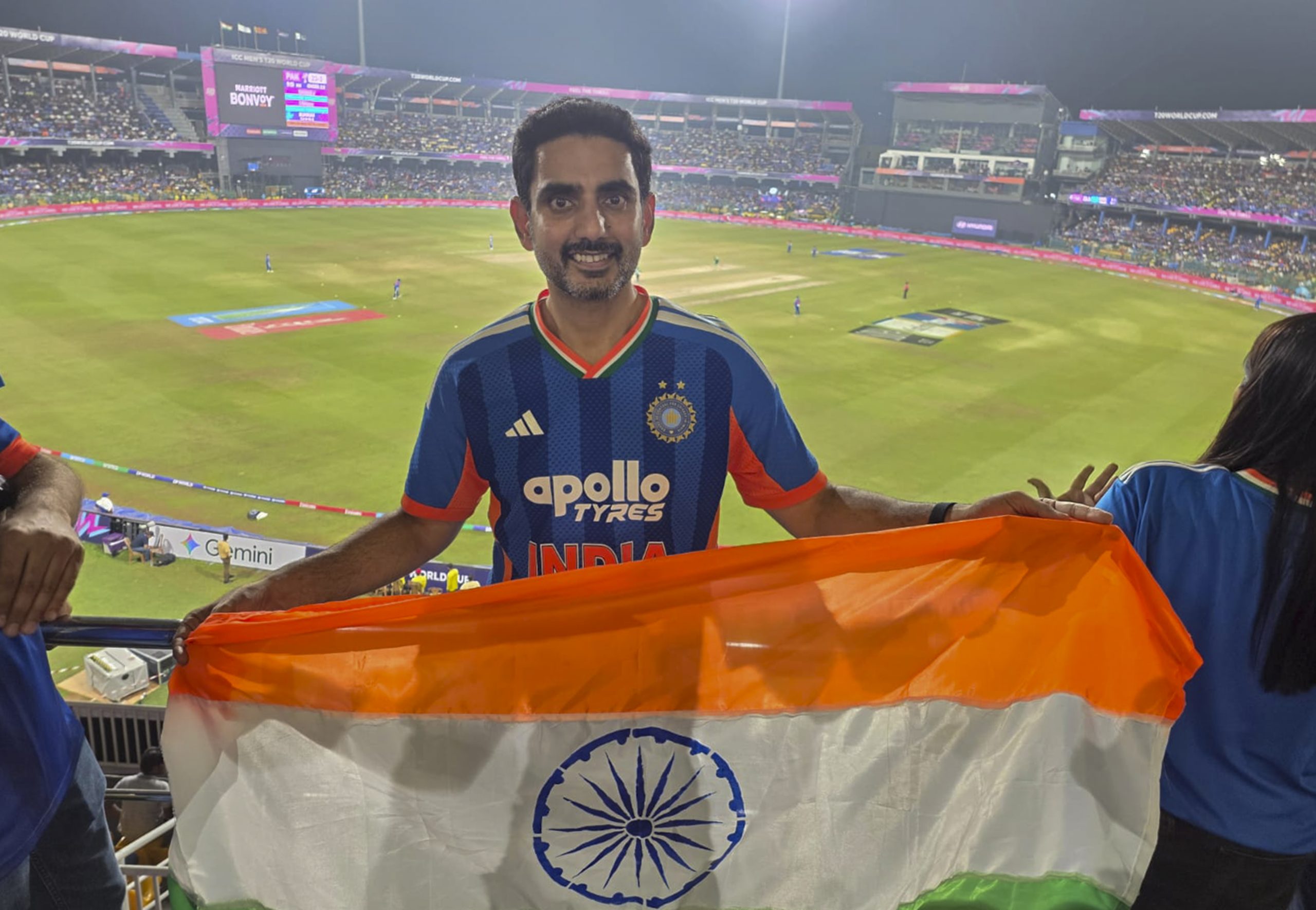 **EDS: THIRD PARTY IMAGE** In this image posted on Feb. 15, 2026, Andhra Pradesh HRD Minister Nara Lokesh during an ICC Men's T20 World Cup 2026 cricket match between India and Pakistan, at R Premadasa Stadium, in Colombo, Sri Lanka. (@naralokesh/X via PTI Photo) (PTI02_15_2026_000925B)