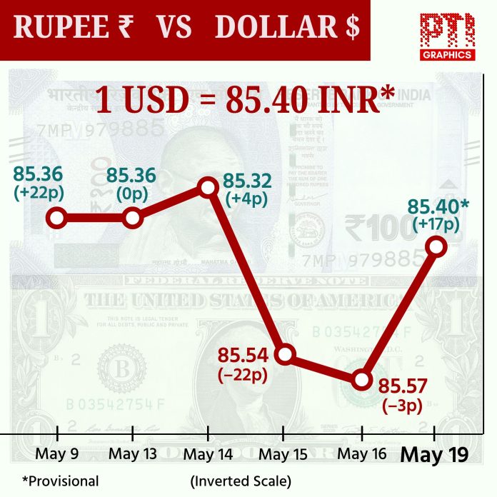 Mumbai, May 19 (PTI) The rupee appreciated 15 paise to settle at 85.42 against the US dollar on Monday, on weak US dollar index and a decline in crude oil prices.