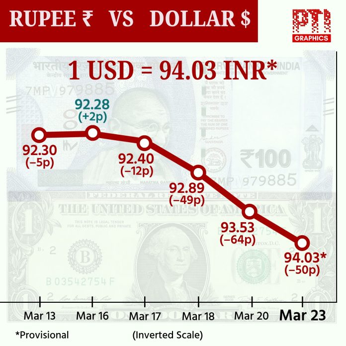 Mumbai, Mar 24 (PTI) The rupee fell 20 paise to 93.73 against the US dollar in early trade on Tuesday as the greenback strengthened and global crude oil prices kept rising even after US President Donald Trump signalled that negotiations were underway with Iran.