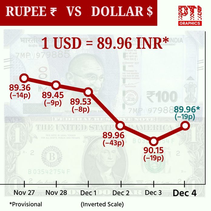 Mumbai, Dec 5 (PTI) The rupee appreciated 20 paise to 89.69 against the US dollar in early trade on Friday, ahead of the Reserve Bank’s monetary policy decision.