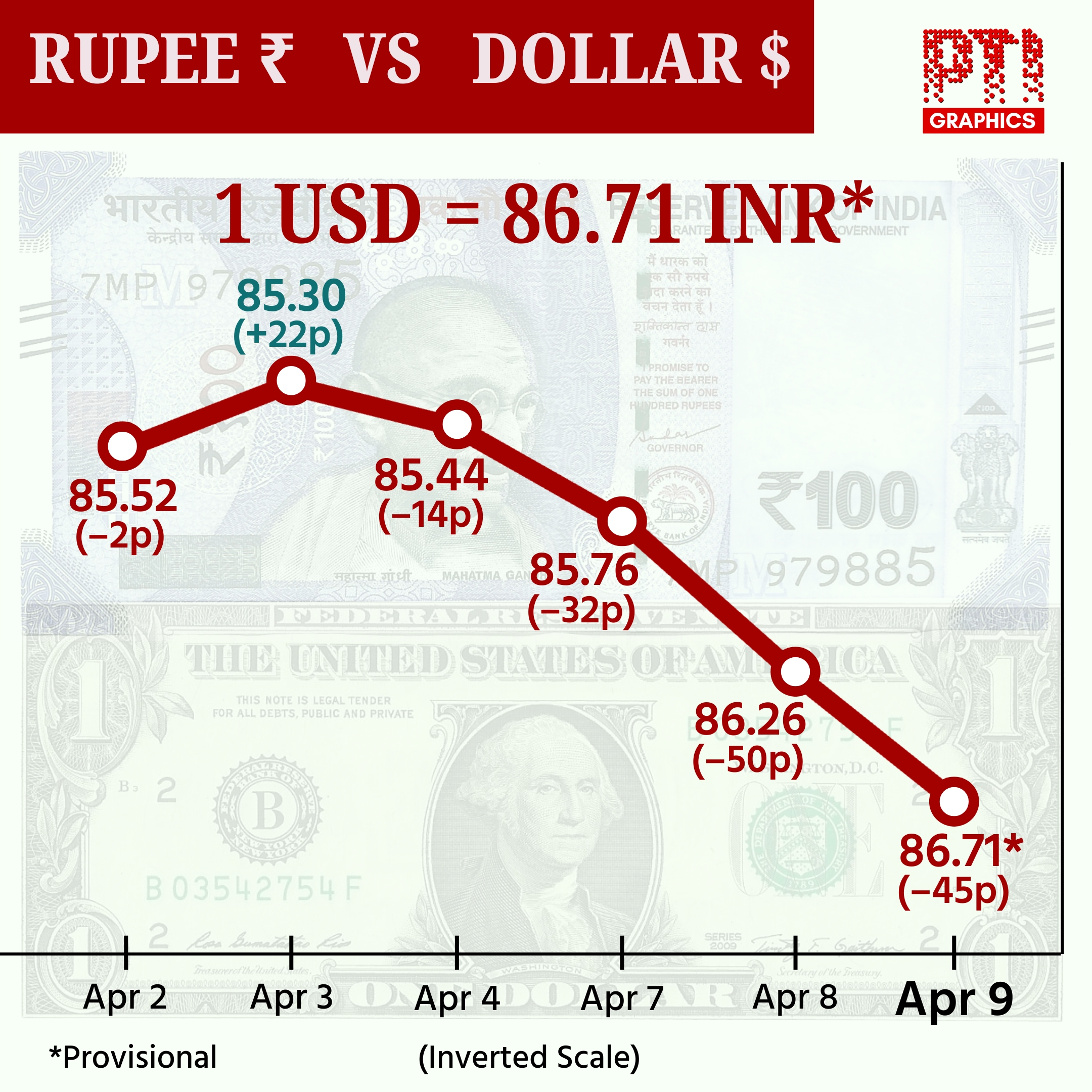 Rupee vs Dollar April 9, 2025 FacebookTwitterPinterestWhatsApp NEW DELHI: RUPEE VS DOLLAR. PTI GRAPHICS.(PTI04_09_2025_001010006B) Rupee vs Dollar NEW DELHI: RUPEE VS DOLLAR. PTI GRAPHICS.(PTI04_09_2025_001010006B)