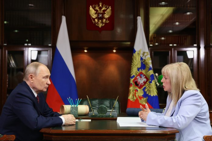 Russian President Vladimir Putin, left, listens to Ella Pamfilova, head of Central Election Commission during a meeting of the Commission at the Central Election Committee in Moscow, Russia, Wednesday, April 1, 2026.AP/PTI(AP04_02_2026_000008B)