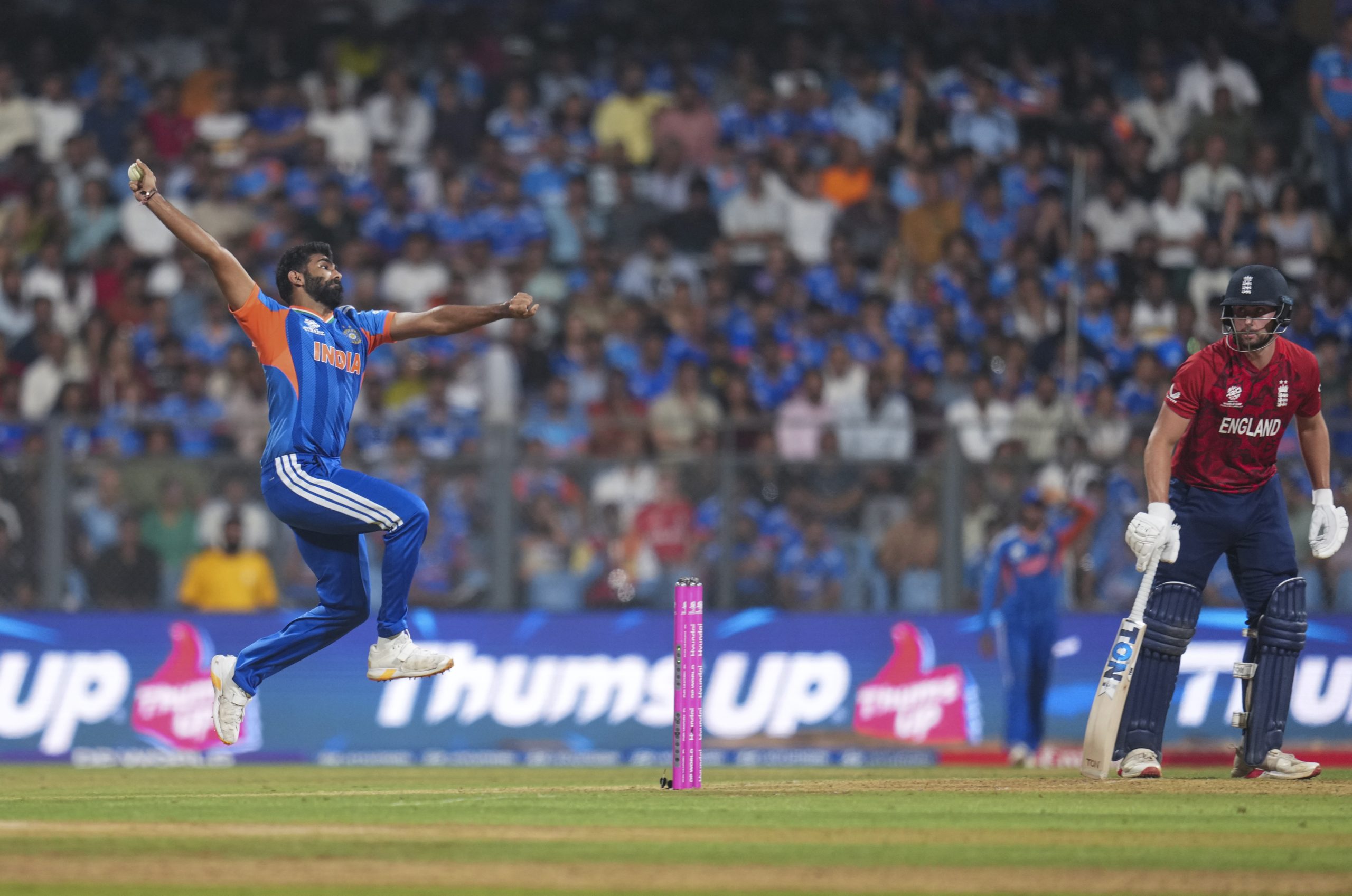 Mumbai: India's Jasprit Bumrah bowls a delivery during the ICC Men's T20 World Cup 2026 second semifinal cricket match between India and England, at the Wankhede Stadium, in Mumbai, Maharashtra, Thursday, March 5, 2026. (PTI Photo/Ravi Choudhary) (PTI03_05_2026_000919B) *** Local Caption ***