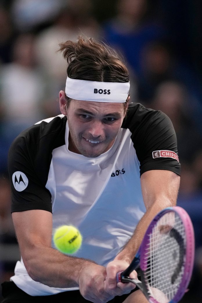 United States' Taylor Fritz plays a shot against United States' Jenson Brooksby during the men's singles semi final match of the Tokyo ATP 500 tennis tournament at Ariake Coliseum, in Tokyo, Monday, Sept. 29, 2025.AP/PTI(AP09_29_2025_000272B)