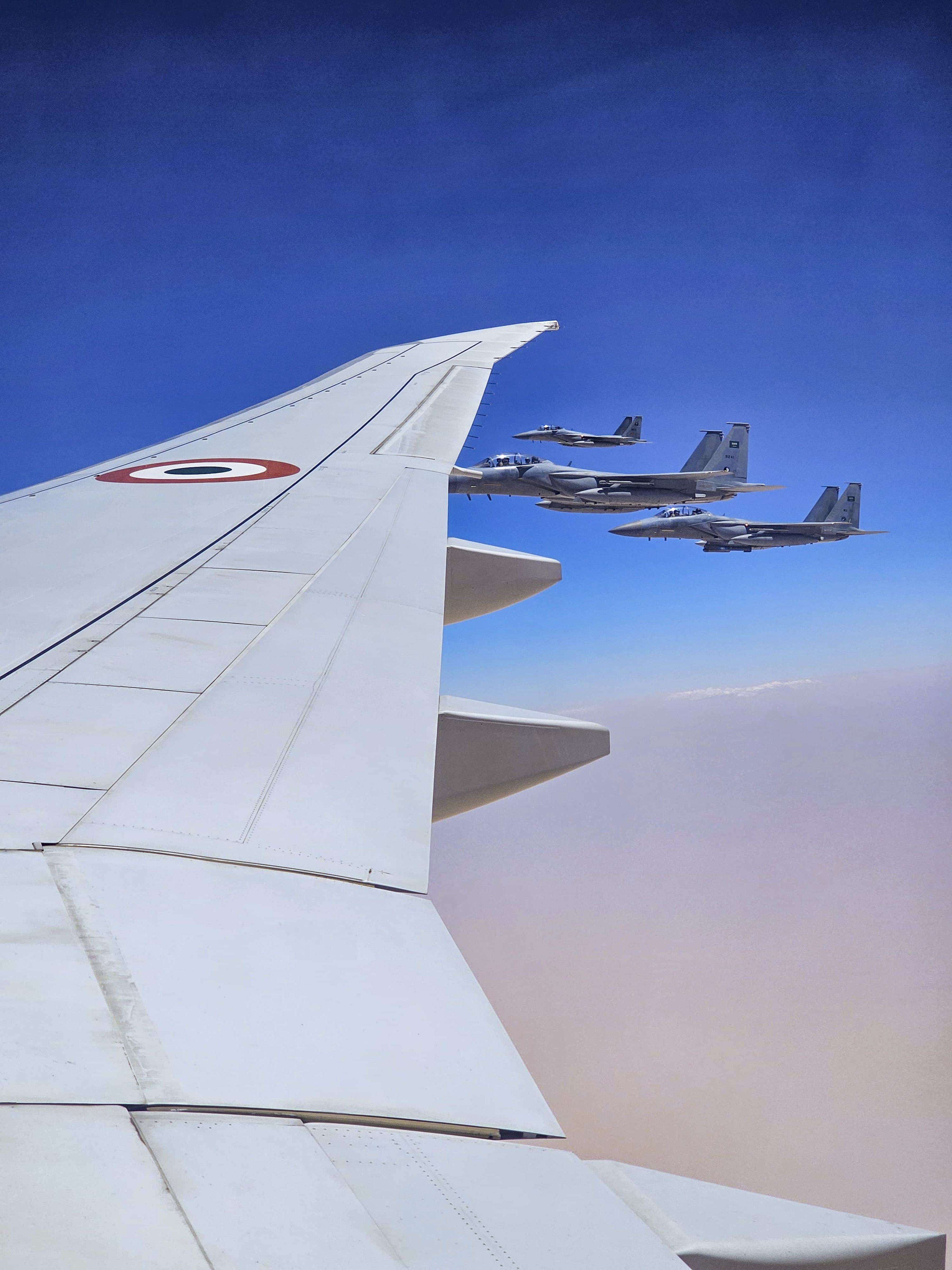 **EDS: THIRD PARTY** In this image provided by MEA on Tuesday, April 22, 2025, Prime Minister Narendra Modi’s aircraft being escorted by F15 planes of the Royal Saudi Air Force in the Saudi airspace. (MEA via PTI Photo) (PTI04_22_2025_000110B) *** Local Caption ***