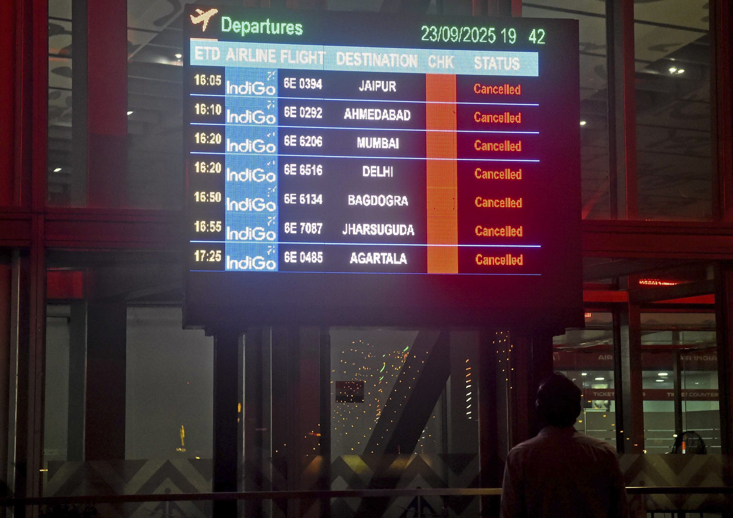 Kolkata: A man looks at a display after several flights were cancelled following rainfall, at Netaji Subhash Chandra Bose International Airport, in Kolkata, Tuesday, Sept. 23, 2025. (PTI Photo)(PTI09_23_2025_000497B)