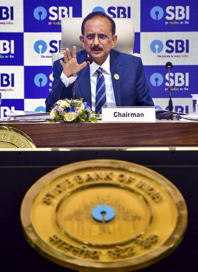 Mumbai: State Bank of India (SBI) Chairman Challa Sreenivasulu Setty addressing the media on results for the fourth quarter ended March 2025, at SBI headquarters, in Mumbai, Saturday, May 3, 2025. (PTI Photo) (PTI05_03_2025_000176B)