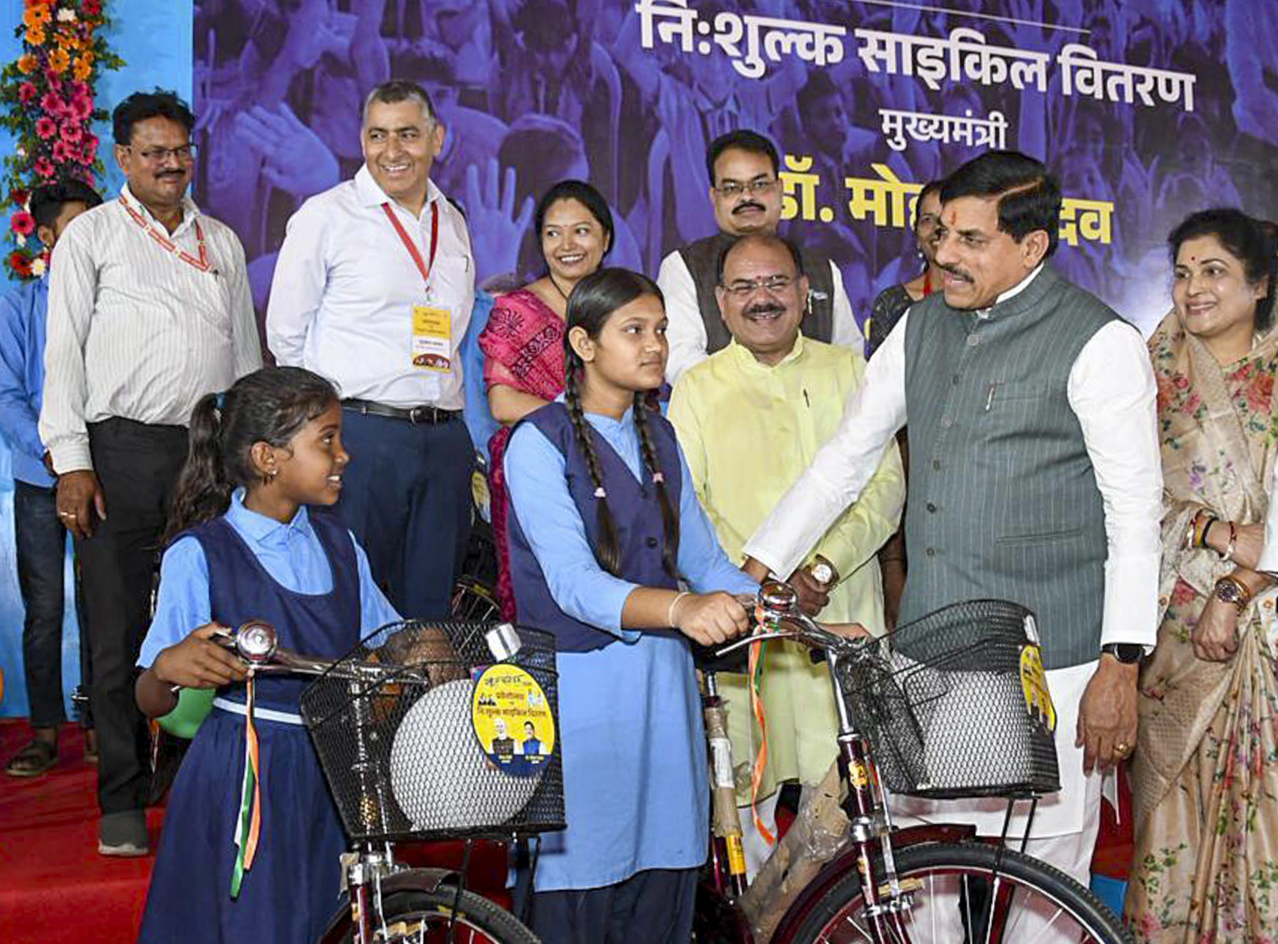 Bhopal: Madhya Pradesh Chief Minister Mohan Yadav during a bicycle distribution ceremony under the �School Chale Hum� initiative, in Bhopal, Wednesday, April 1, 2026. (PTI Photo) (PTI04_01_2026_000346B)
