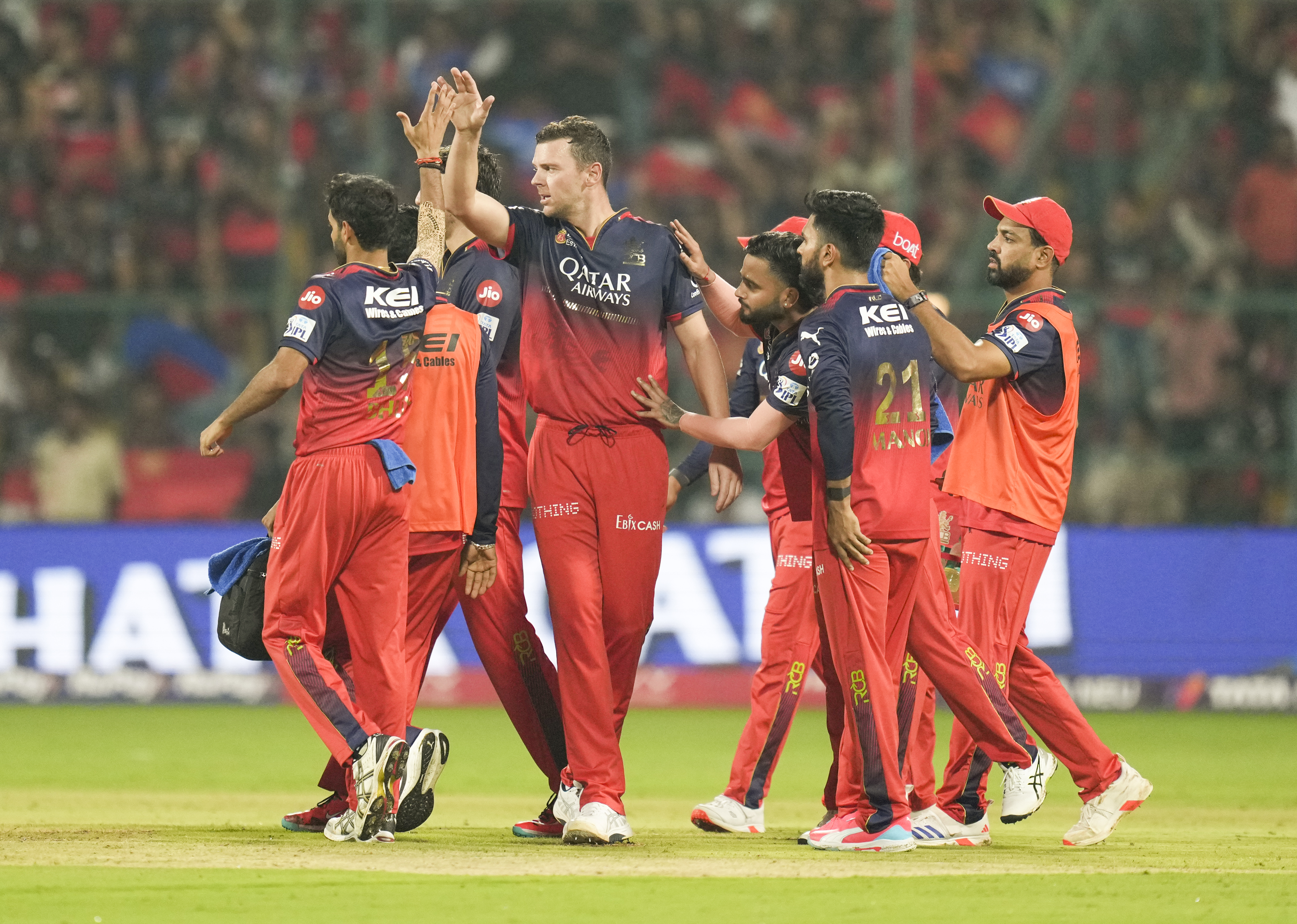 Bowling: Bhuvneshwar Kumar 3-0-26-2, Yash Dayal 2.1-0-18-0, Josh Hazlewood 3-0-14-3, Krunal Pandya 1-0-10-0, Suyash Sharma 3-0-25-0. PTI AM AM AM