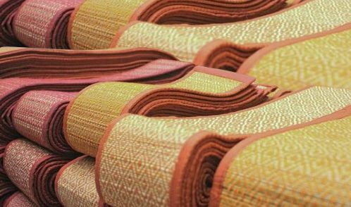 - Weaving the mat: it is one up one down plain structure done by hands.it is most commonly adopted. Twill leave pattern is also brought into use as a new technique. to end the edges for smoothing out the open ends are tucked in in reverse direction. it takes around 1 day to weave 6ft. by 3ft. of a mat. finer strands increase the time likewise.
