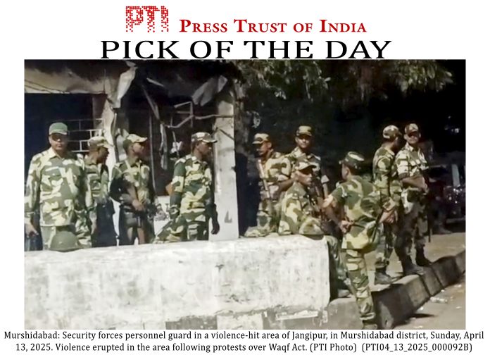 PLS TAKE NOTE OF THIS PTI PICK OF THE DAY::: Murshidabad: Security forces personnel guard in a violence-hit area of Jangipur, in Murshidabad district, Sunday, April 13, 2025. Violence erupted in the area following protests over Waqf Act. (PTI Photo) (PTI04_13_2025_000092B)(PTI04_13_2025_000269B)