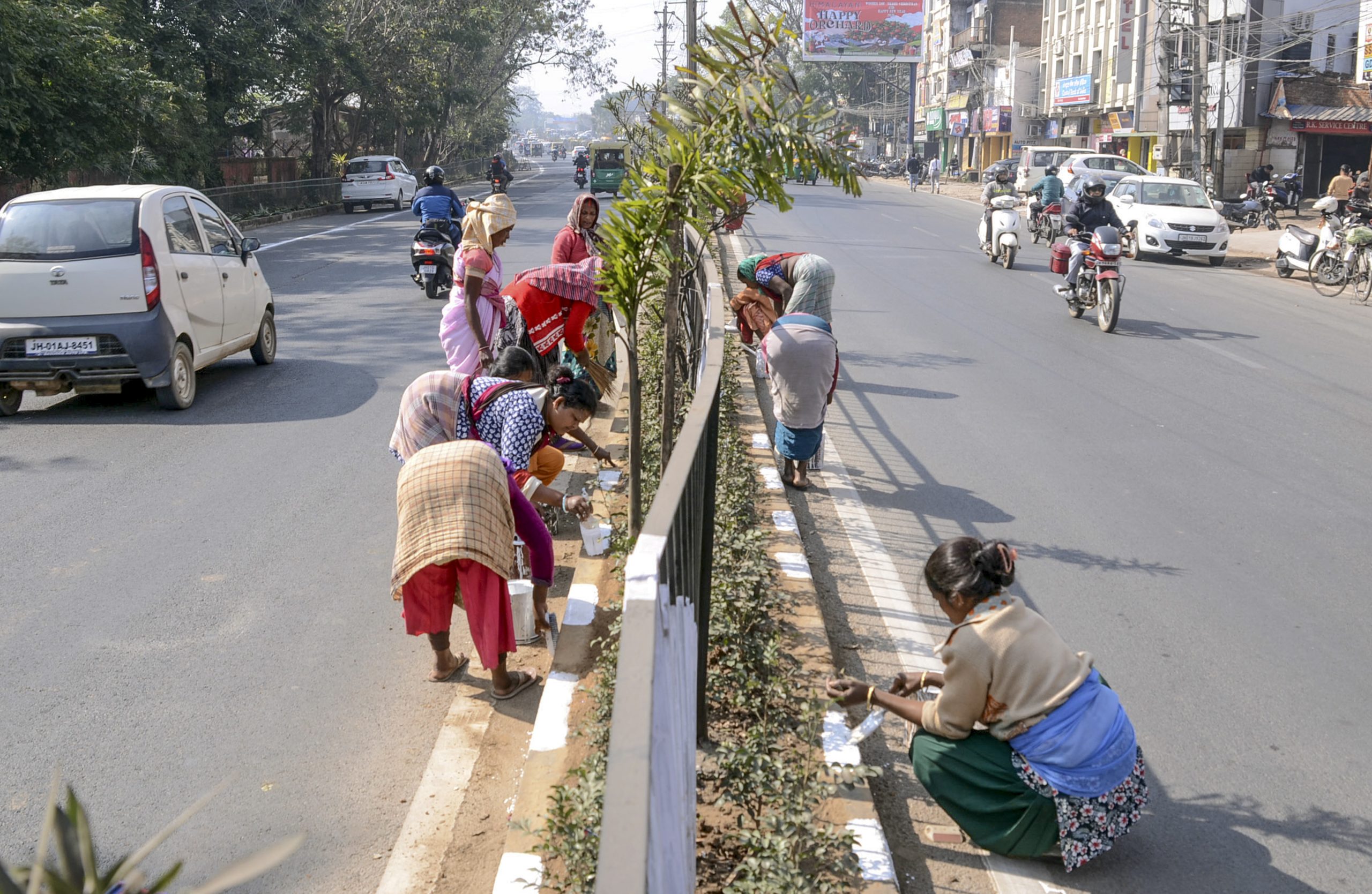 Ranchi: Workers paint road dividers ahead of the President Droupadi Murmu’s scheduled visit, in Ranchi, Saturday, Dec. 27, 2025. (PTI Photo)(PTI12_27_2025_000101B)