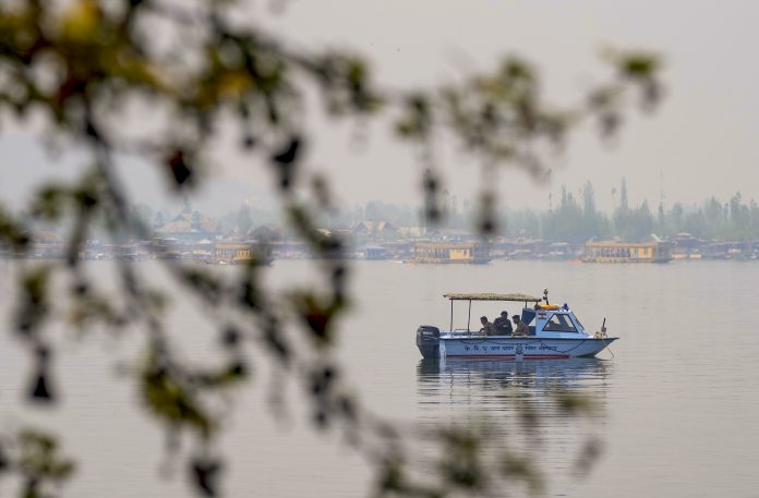 Srinagar: Security personnel patrol on a boat at Dal Lake after security was beefed up across Kashmir in view of Union Home Minister Amit Shah’s visit, in Srinagar, Monday, April 7, 2025. (PTI Photo/S Irfan)(PTI04_07_2025_000144B)