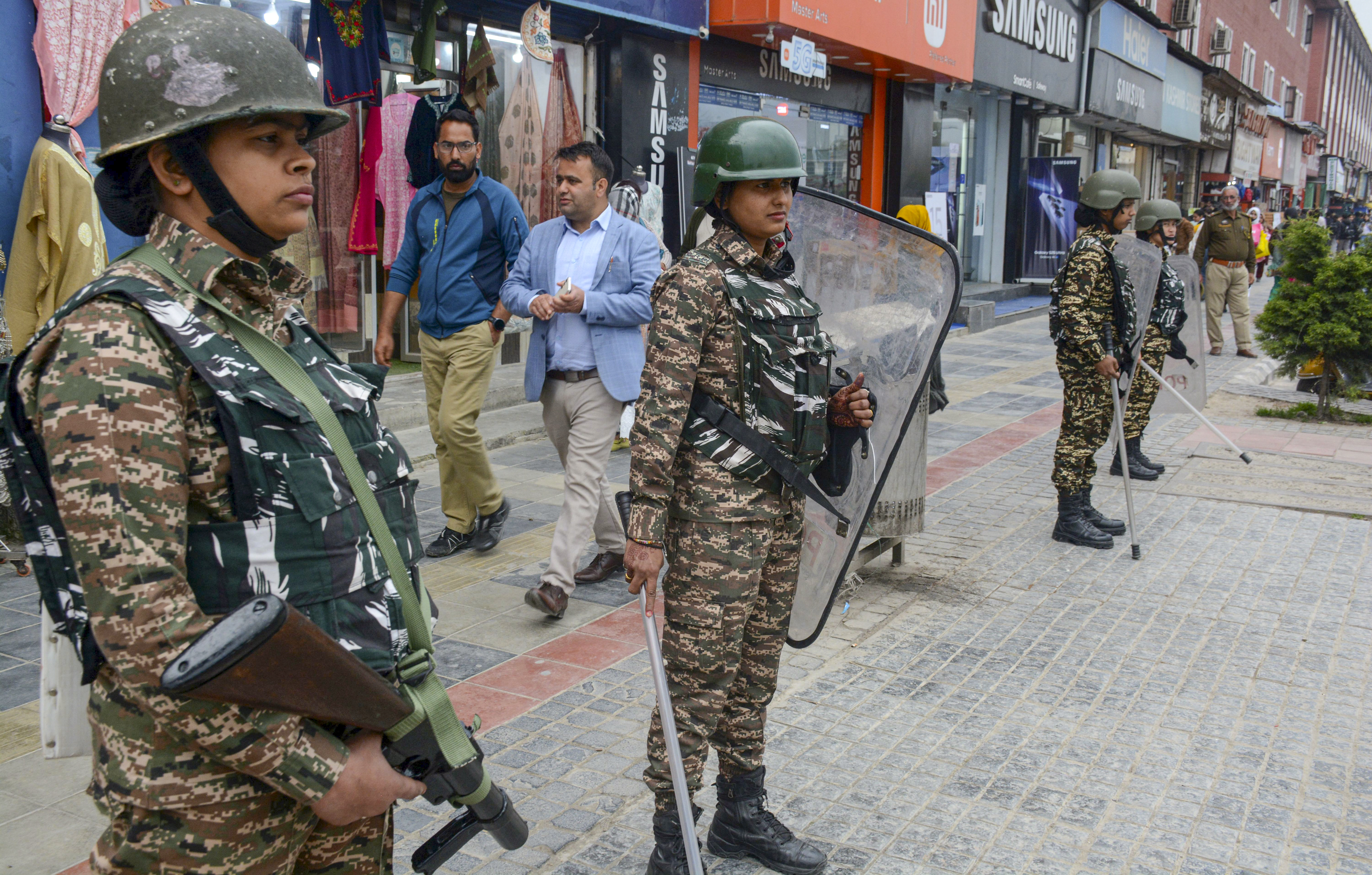 Srinagar: Security personnel keep vigil amid heightened security for Union Home Minister Amit Shah's visit, in Srinagar, Tuesday, April 8, 2025. (PTI Photo)(PTI04_08_2025_000357B)