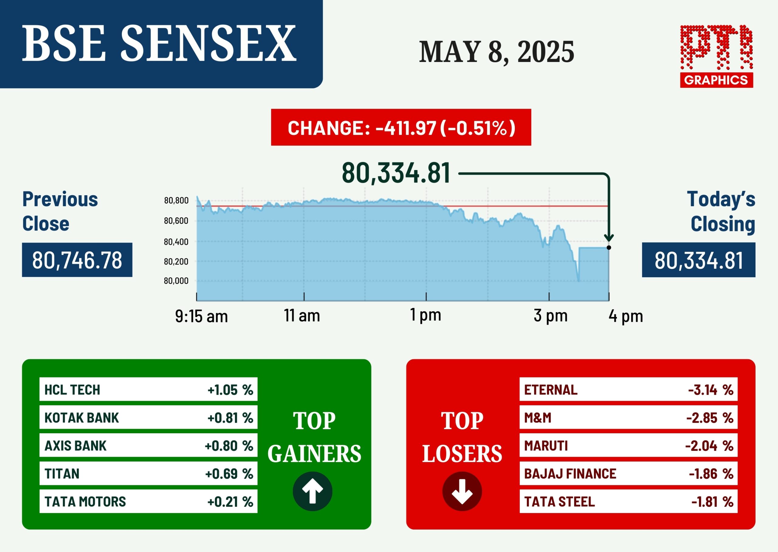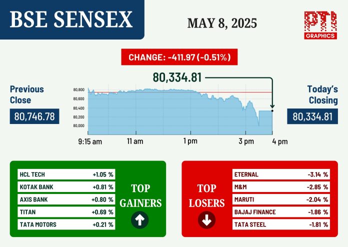 The BSE Sensex declined by 411.97 points or 0.51 per cent to settle at 80,334.81 on Thursday. The Nifty ended lower by 140.60 points or 0.58 per cent at 24,273.80. PTI SUM DR