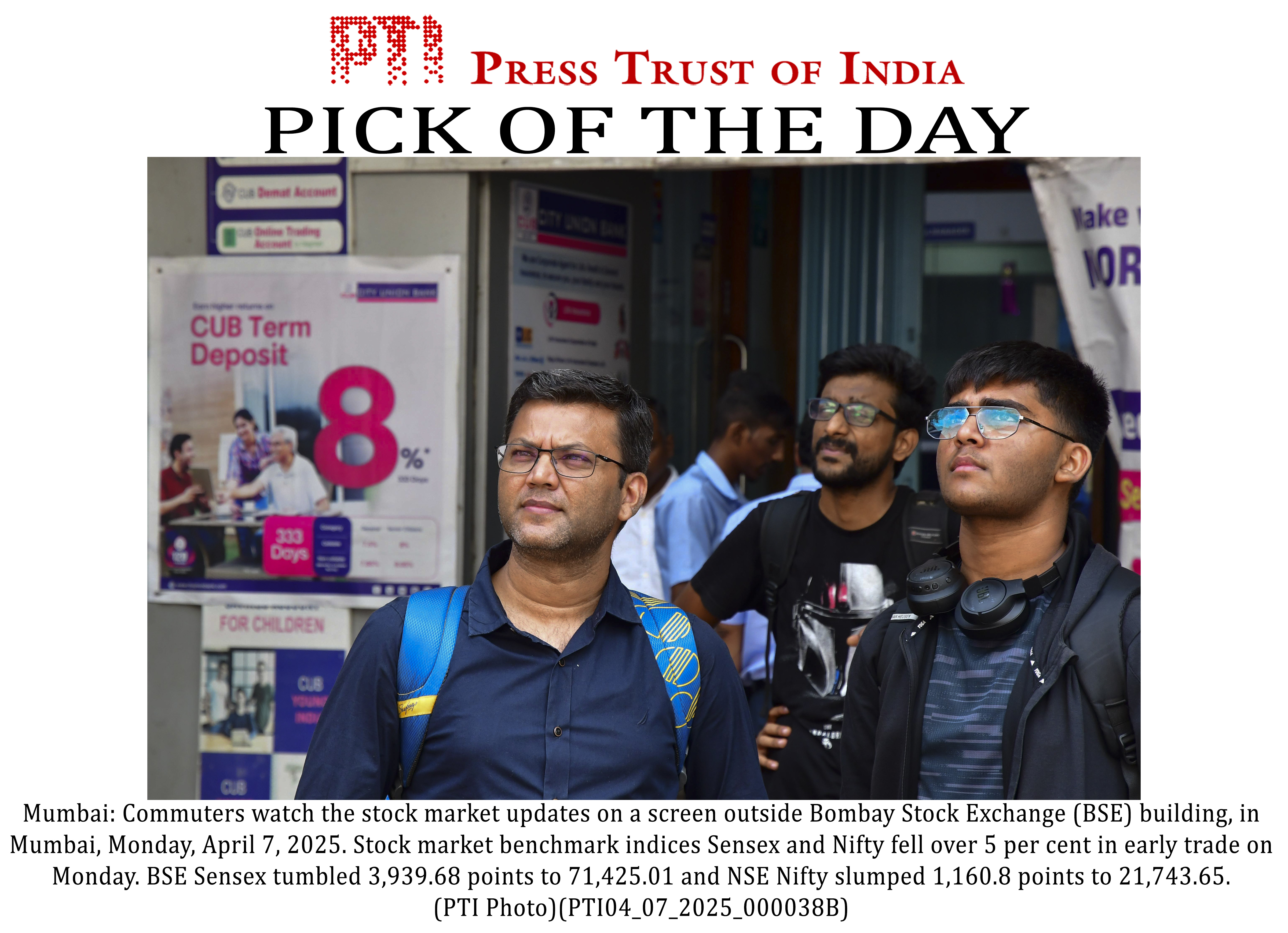 PLS TAKE NOTE OF THIS PTI PICK OF THE DAY::: Mumbai: Commuters watch the stock market updates on a screen outside Bombay Stock Exchange (BSE) building, in Mumbai, Monday, April 7, 2025. Stock market benchmark indices Sensex and Nifty fell over 5 per cent in early trade on Monday. BSE Sensex tumbled 3,939.68 points to 71,425.01 and NSE Nifty slumped 1,160.8 points to 21,743.65. (PTI Photo)(PTI04_07_2025_000038B)(PTI04_07_2025_000260B)