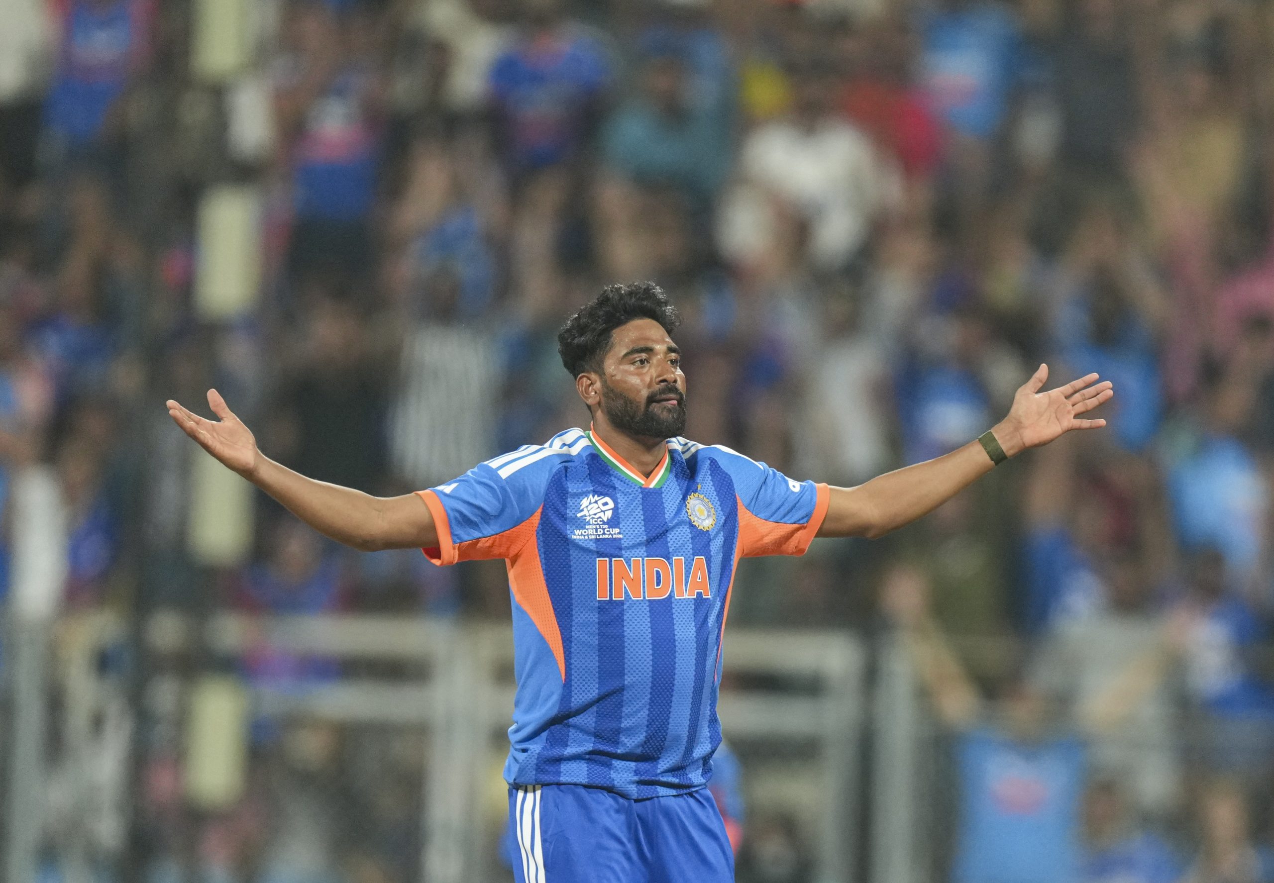 Mumbai: India's Mohammed Siraj celebrates after taking the wicket of USA's Saiteja Mukkamalla during the ICC Men's T20 World Cup 2026 cricket match between India and USA, at the Wankhede Stadium, in Mumbai, Saturday, Feb. 7, 2026. (PTI Photo/Kunal Patil)(PTI02_07_2026_000754B)