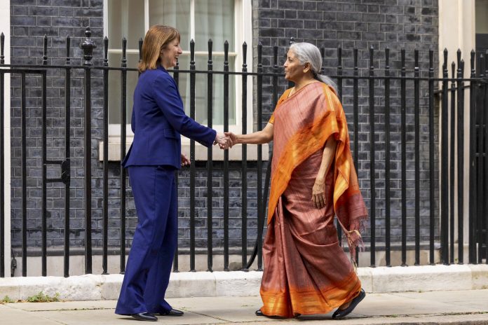 **EDS: THIRD PARTY IMAGE** In this image posted by @FinMinIndia via X on Wednesday, April 9, 2025, Union Finance Minister Nirmala Sitharaman meets the Chancellor of the Exchequer of the United Kingdom Rachel Reeves, at 11 Downing Street, in London. (@FinMinIndia on X via PTI Photo) (PTI04_09_2025_000493B)