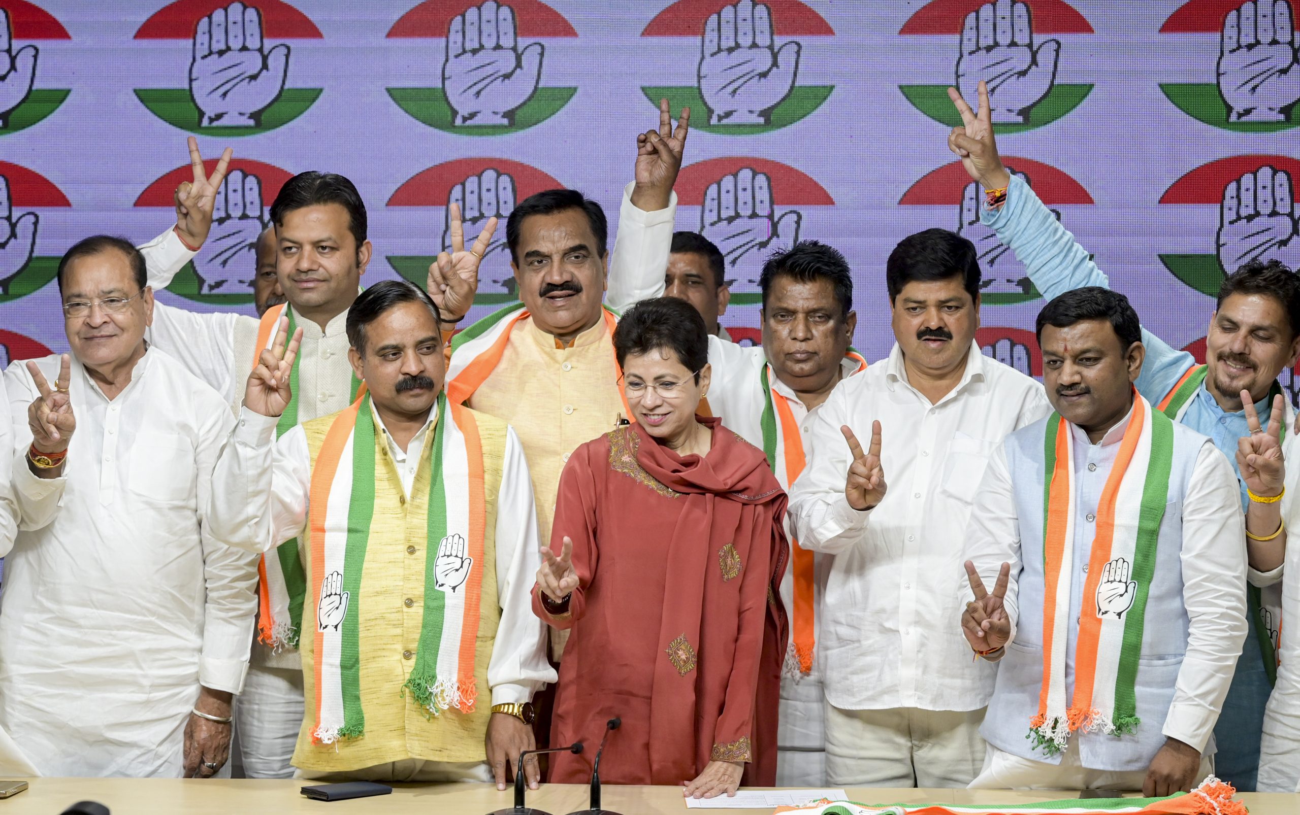 New Delhi: Congress leader Kumari Selja felicitates former BJP MLAs Rajkumar Thukral and Bhimlal Arya, former Roorkee mayor Gaurav Goyal, BJP leaders Lakhan Singh Negi and Anuj Gupta and BSP leader Narayan Pal after joining the Congress party, at the party office, in New Delhi, Saturday, March 28 2026. (PTI Photo) (PTI03_28_2026_000271B)