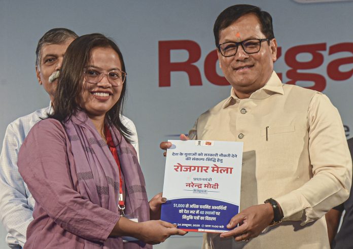 Guwahati: Union Minister of Ports, Shipping and Waterways Sarbananda Sonowal distributes an appointment letter to a candidate during the ‘17th Rozgar Mela’, in Guwahati, Assam, Friday, Oct. 24, 2025. (PTI Photo) (PTI10_24_2025_000098B)