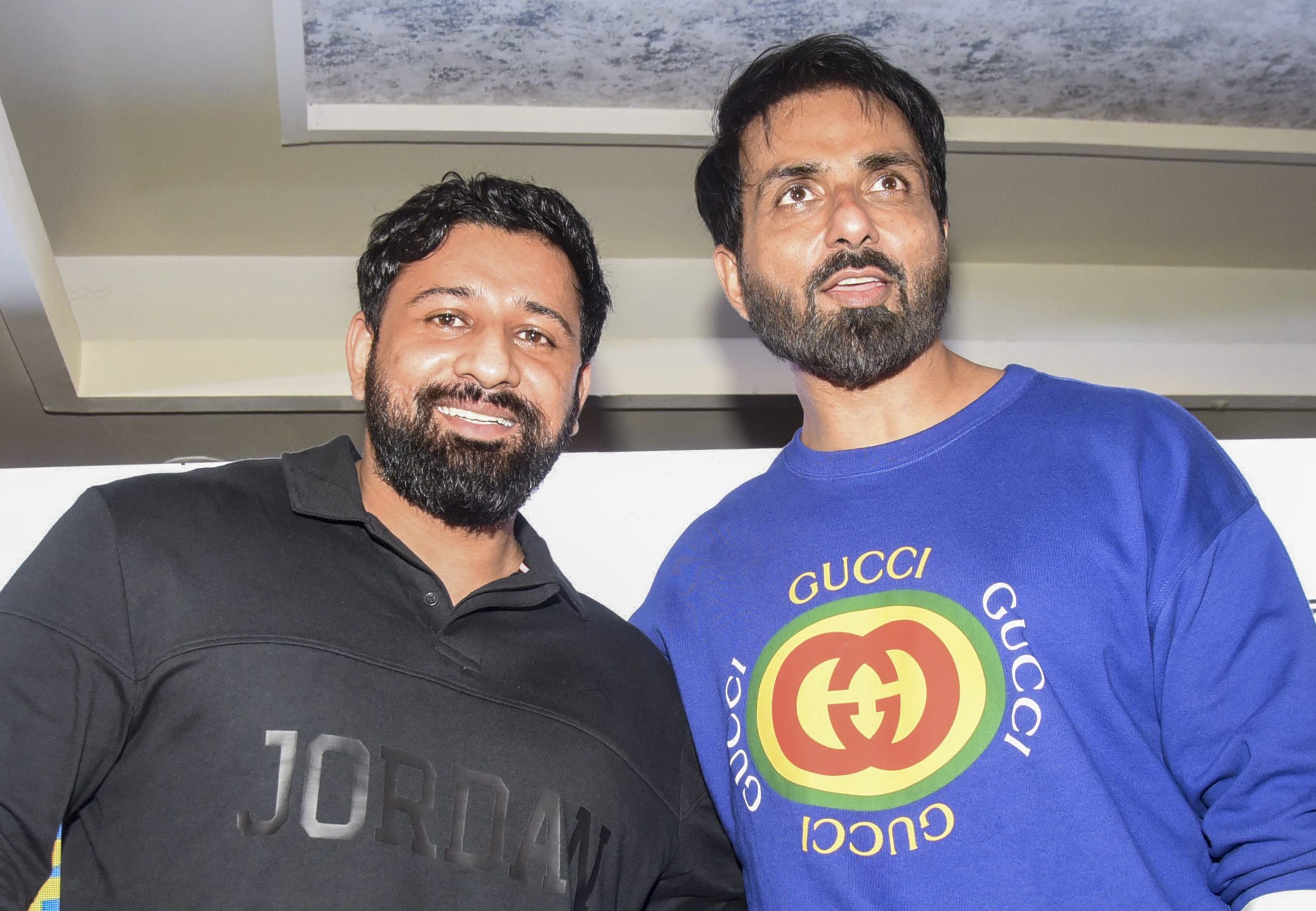 Patna: Bollywood actor Sonu Sood, right, and influencer Rajat Dalal during ‘Bihar Sports Mahasangram’ press conference, in Patna, Saturday, Sept. 13, 2025. (PTI Photo) (PTI09_13_2025_000492B)