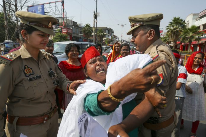 Prayagraj: Police stop Samajwadi Party woman workers who were staging a protest against Delhi CM Rekha Gupta over her comment on Party President Akhilesh Yadav, in Prayagraj, Friday, April 11, 2025. (PTI Photo) (PTI04_11_2025_000194B)