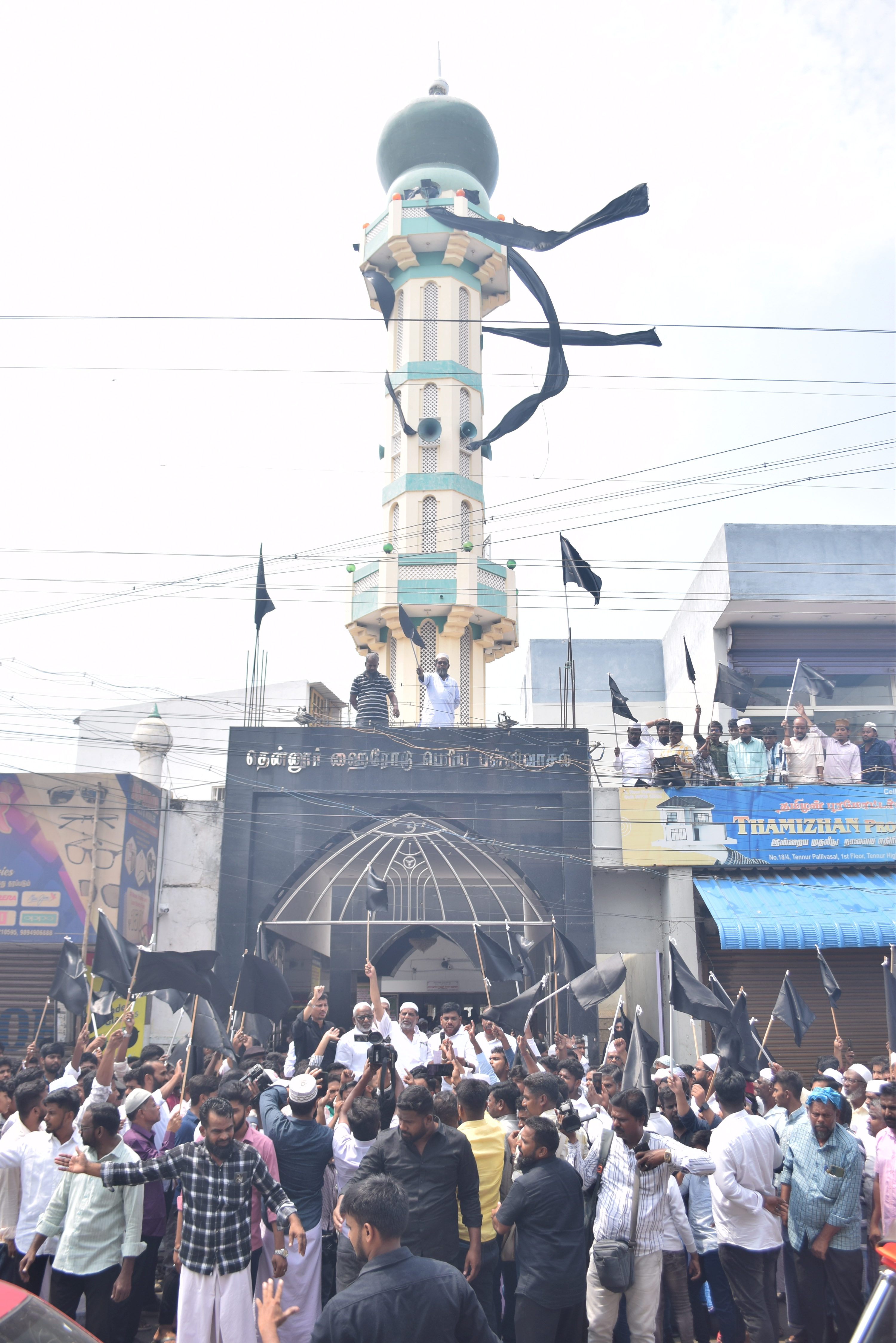 Tiruchirappalli: People wave black flags in protest against the Waqf (Amendment) Act, at a mosque, in Tiruchirappalli, Tamil Nadu, Friday, April 11, 2025. (PTI Photo) (PTI04_11_2025_000639B)