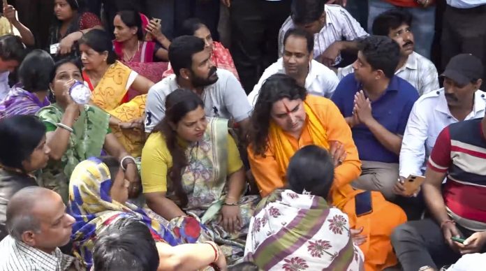 **EDS: SCREENSHOT VIA PTI VIDEOS** Jaipur: BJP MLA Balmukund Acharya meets people during a protest demanding justice after an SUV driver allegedly hit multiple pedestrians and vehicles in a seven-km stretch, in Jaipur, Tuesday, April 8, 2025. At least three people were dead and six others seriously injured in the accident, according to officials. (PTI Photo)(PTI04_08_2025_000331B)