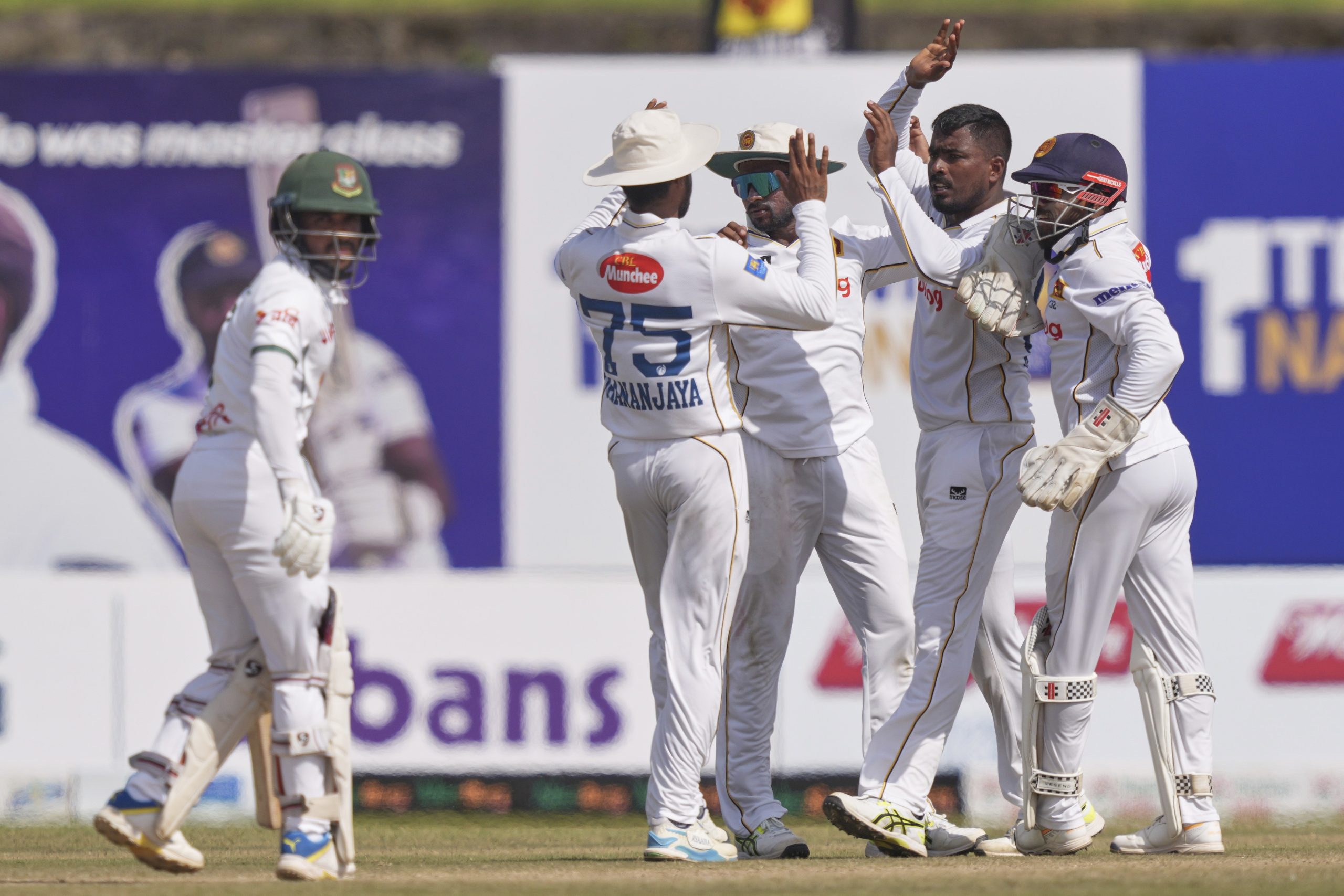 Sri Lanka's Tharindu Ratnayake celebrates the wicket of Bangladesh's Mominul Haque during day four of the first cricket test match between Sri Lanka and Bangladesh in Galle, Sri Lanka, Friday, June 20, 2025.AP/PTI(AP06_20_2025_000240B)